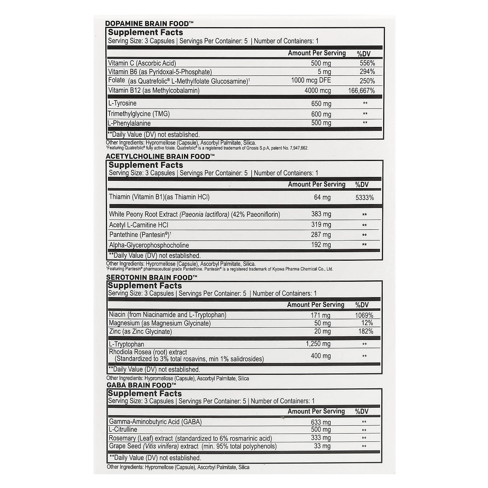Dopamine Brain Food ™: Гипромеллоза (капсула), аскорбил пальмитат, диоксид кремния.