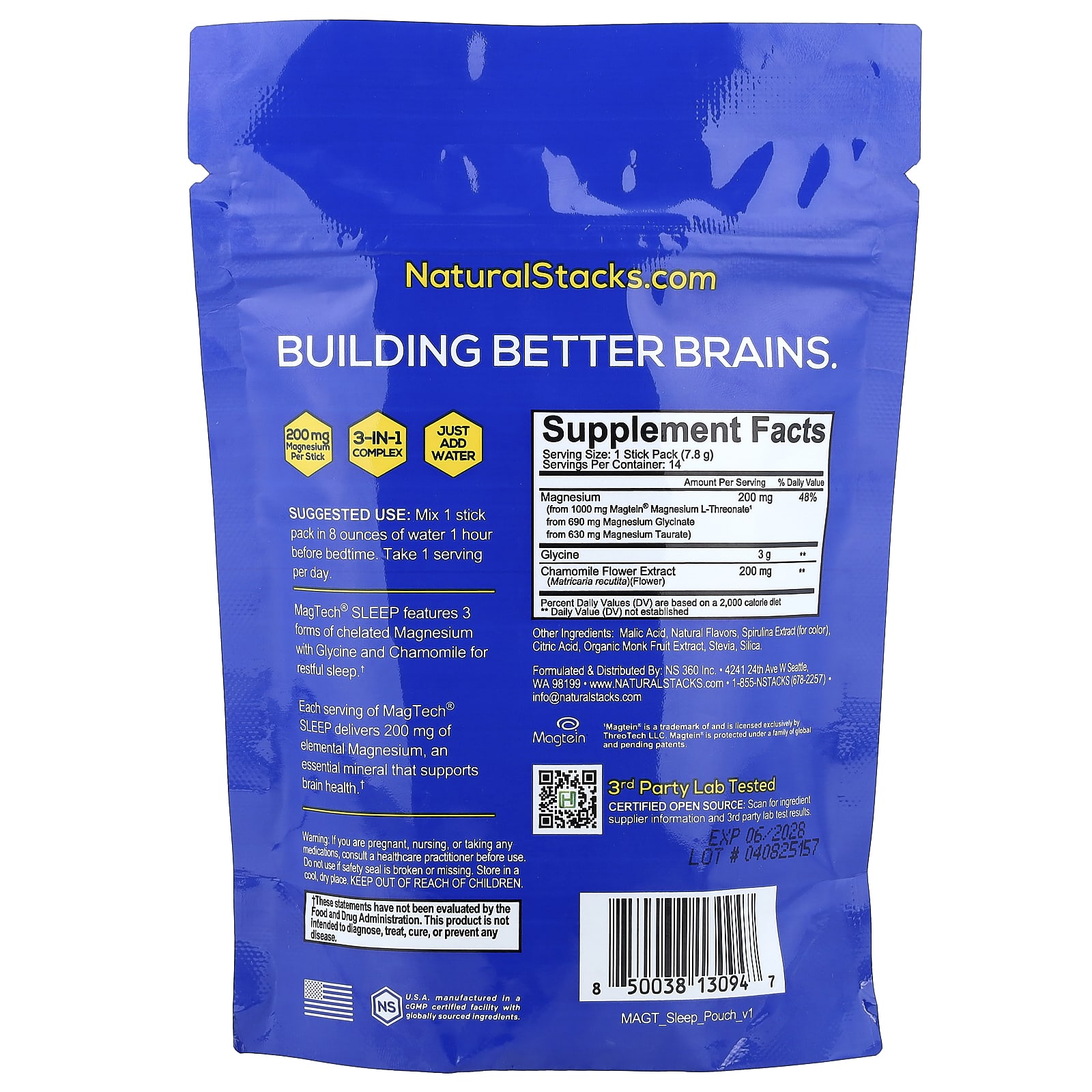 Каждая порция MagTech® SLEEP содержит 200 мг элементарного магния, важного минерала, поддерживающего здоровье мозга.