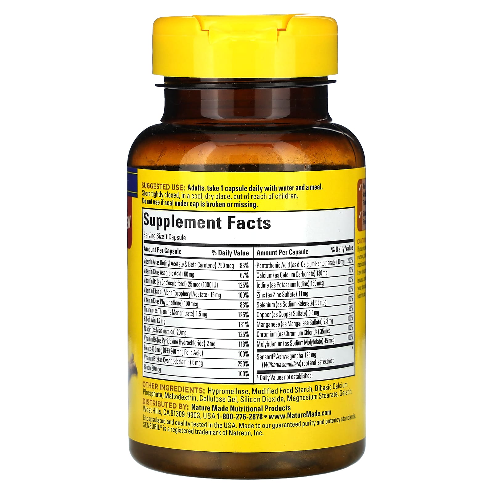 Плюс для повседневной жизни: Мультивитамины и ашваганда Nature Made® — это мультивитаминный комплекс с дополнительным действием стресса. Одна капсула содержит 21 основное питательное вещество для ежедневной поддержки питания, включая ключевые питательные вещества, такие как витамин С для поддержки здоровья иммунной системы, витамин D для поддержки здоровья костей, зубов, мышц и иммунной системы, витамины группы B для поддержки работы клеток мозга и выработки клеточной энергии, а также Магний для расслабления мышц и поддержания здоровья нервной системы, сердца и костей. Кроме того, каждая капсула содержит ашваганду Sensoril® для снижения стресса и периодической тревожности.