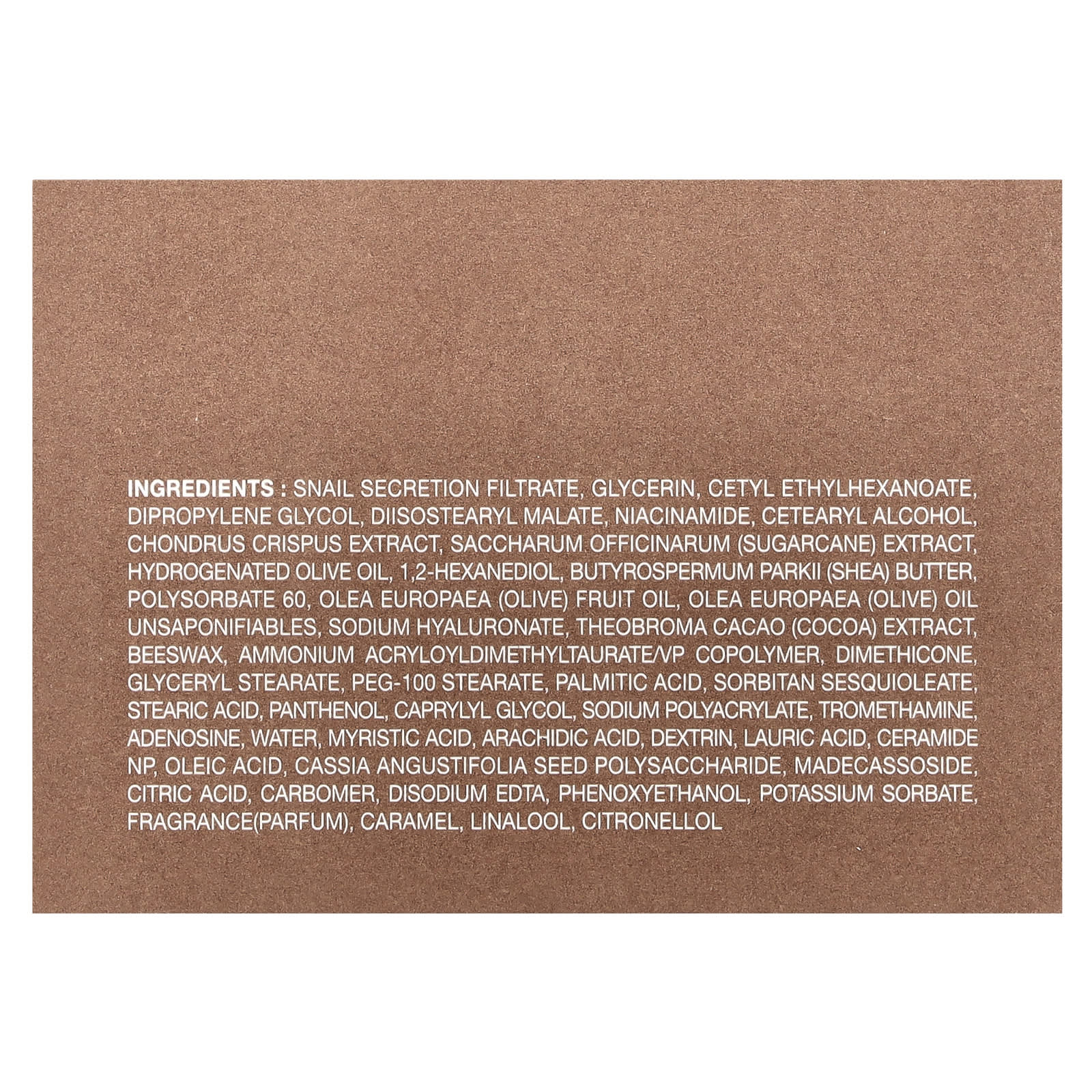 Фильтрат секрета улитки, глицерин, цетил этилгексаноат дипропиленгликоль, диизостеарил малат, никотинамид, цетеариловый спирт, экстракт ирландского мха (Chondrus crispus), экстракт сахарного тростника (Saccharum officinarum), гидрогенизированное оливковое масло, 1,2-гександиол, масло ши (Butyrospermum parkii), полисорбат 60, оливковое масло (Olea europaea), неомыляемое оливковое масло (Olea europaea), гиалуронат натрия, экстракт какао (Theobroma cacao), пчелиный воск, аммоний акрилоилдиметилтаурат/ВП сополимер, диметикон, глицерил стеарат, ПЭГ-100 стеарат, пальмитиновая кислота, сорбитан сесквиолеат стеариновой кислоты, пантенол, каприлилгликоль, полиакрилат натрия, трометамин, аденозин, вода, миристиновая кислота, арахиновая кислота, декстрин, лауриновая кислота, керамид NP, олеиновая кислота, полисахарид из семян сенны александрийской (Cassia angustifolia), мадекассосид, лимонная кислота, карбомер, двунатриевая ЭДТК, феноксиэтанол, сорбат калия, отдушка (парфюмерная композиция), карамель, линалоол, цитронеллол.