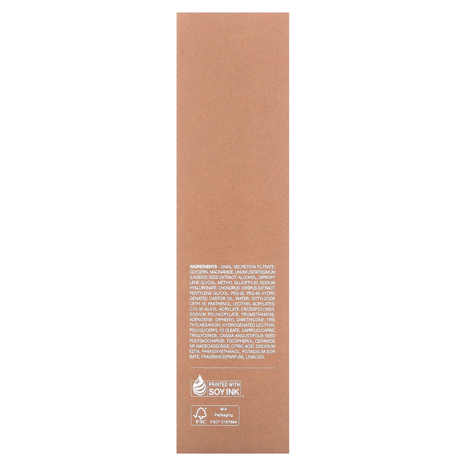 Фильтрат секрета улитки, глицерин, никотинамид, экстракт семян льна (Linum usitatissimum), спирт, дипропиленгликоль, метил глюцет-20, гиалуронат натрия, экстракт ирландского мха (Chondrus crispus), пентилен гликоль, ПЭГ-32, ПЭГ-60 гидрогенизированное касторовое масло, вода, октилдодецет-16, пантенол, лецитин, акрилат/c10-30 алкил акрилат кроссполимер, полиакрилат натрия, трометамин, аденозин, дифенил диметикон, триэтилгексаноин, гидрогенизированный лецитин полиглицерил-10 олеат, каприловый/каприновый триглицерид, полисахарид из семян сенны александрийской (Cassia angustifolia), токоферол, керамид NP, мадекассосид, лимонная кислота, двунатриевая ЭДТК, феноксиэтанол, сорбат калия, отдушка (парфюмерная композиция), линалоол.