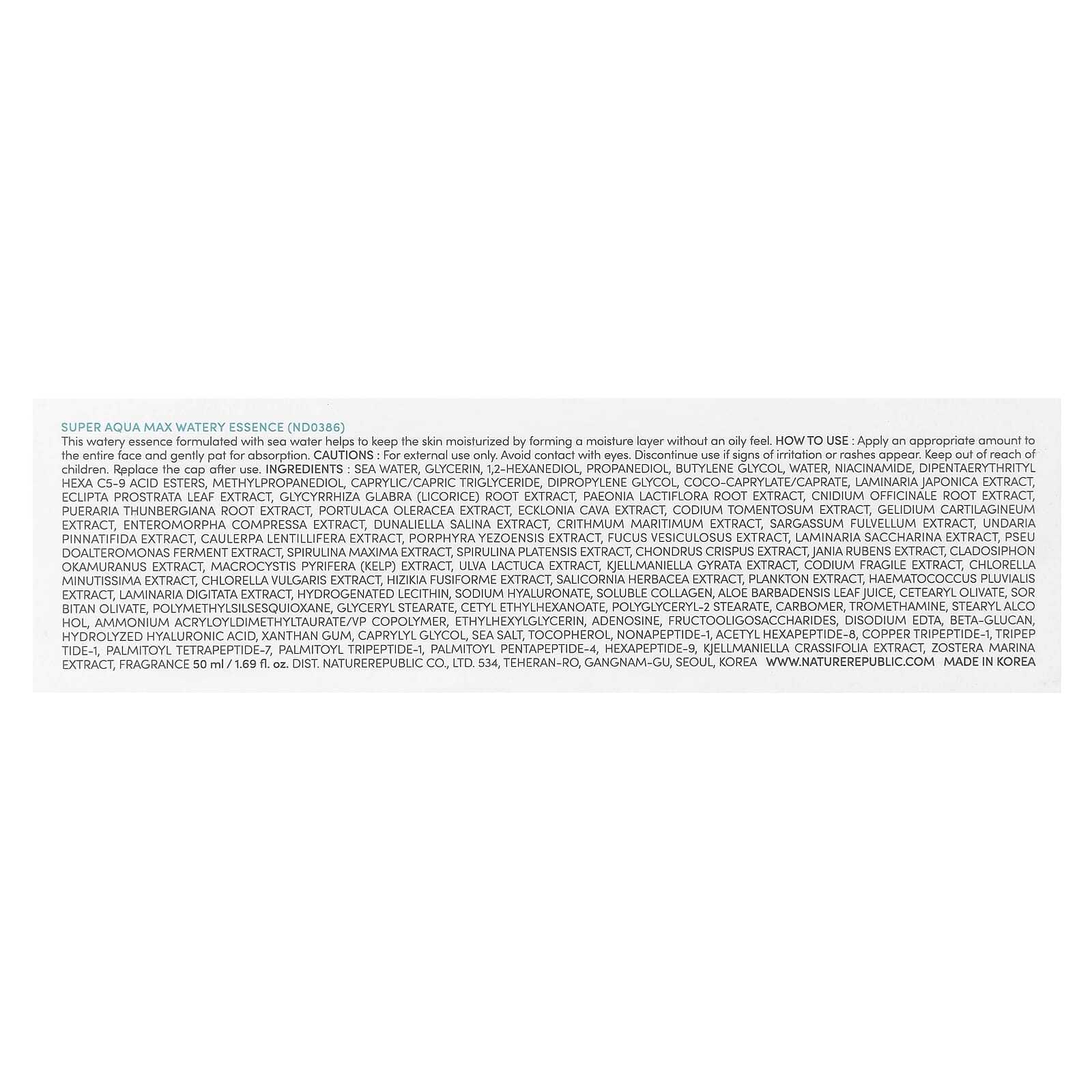 Морская вода, глицерин, 1,2-гександиол, пропандиол, бутиленгликоль, вода, никотинамид, дипентаэритрил гекса С5-9 кислотные эфиры, метилпропандиол, каприловый/каприновый триглицерид, дипропиленгликоль, коко-каприлат/капрат, экстракт ламинарии японской (Laminaria japonica), экстракт листьев эклипты простертой (Eclipta prostrata), экстракт корня солодки (Glycyrrhiza glabra), экстракт корня пиона молочноцветкового (Paeonia lactiflora), экстракт корня жгун-корня (Cnidium officinale), экстракт корня пуэрарии дольчатой (Pueraria thunbergiana), экстракт портулака огородного (Portulaca oleracea), экстракт водоросли эклонии кавы (Ecklonia cava), экстракт кодиума (Codium tomentosum), экстракт агарофита (Gelidium cartilagineum), экстракт энтероморфы компрессы (Enteromorpha compressa), экстракт дуналиеллы солоноводной (Dunaliella salina), экстракт критмума (Crithmum maritimum), экстракт саргассума (Sargassum fulvellum), экстракт ундарии перистой (Undaria pinnatifida), экстракт морского винограда (Caulerpa lentillifera), экстракт порфиры (Porphyra yezoensis), экстракт фукуса (Fucus vesiculosus), экстракт ламинарии сахаристой (Laminaria saccharina), экстракт фермента Pseu doalteromonas, экстракт спирулины (Spirulina maxima), экстракт спирулины (Spirulina platensis), экстракт ирландского мха (Chondrus crispus), экстракт жании рубенс (Jania rubens), экстракт мозуку (Cladosiphon okamuranus), экстракт макроцистиса грушевидного (Macrocystis pyrifera), экстракт ульвы латука (Ulva lactuca), экстракт кьельманиеллы гирата (Kjellmaniella gyrata), экстракт кодиума (Codium fragile), экстракт хлореллы (Minutissima), экстракт хлореллы (Chlorella vulgaris), экстракт хидзики (Hizikia fusiforme), экстракт солероса европейского (Salicornia herbacea), экстракт планктона, экстракт гематококка дождевого (Haematococcus pluvialis), экстракт ламинарии пальчаторассеченной (Laminaria digitata), гидрогенизированный лецитин, гиалуронат натрия, растворимый коллаген, сок из листьев алоэ вера (Aloe barbadensis), цетеарил оливат, сорбитан оливат, полиметилсилсесквиоксан, глицерил стеарат, цетилэтилгексаноат, полиглицерил-2 стеарат, карбомер, трометамин, стеариловый спирт, аммоний акрилоилдиметилтаурат/ВП сополимер, этилгексилглицерин, аденозин, фруктоолигосахариды, двунатриевая ЭДТК, бета-глюкан, гидролизованная гиалуроновая кислота, ксантановая камедь, каприлилгликоль, морская соль, токоферол, нонапептид-1, ацетил гексапептид-8, меди трипептид-1, трипептид-1, пальмитоил тетрапептид-7, пальмитоил трипептид-1, пальмитоил пентапептид-4, гексапептид-9, экстракт кьельманиеллы толстолистной, экстракт зостеры маринованной, отдушка.