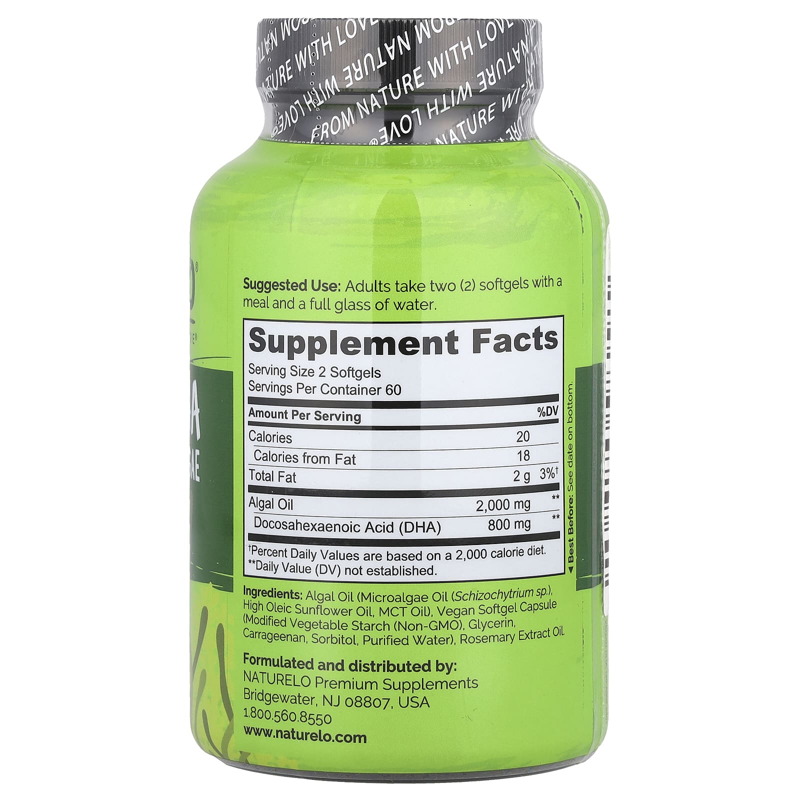 NATURELO, ДГК для веганов, омега-3 из водорослей, 120 веганских капсул (400 мг в 1 капсуле)