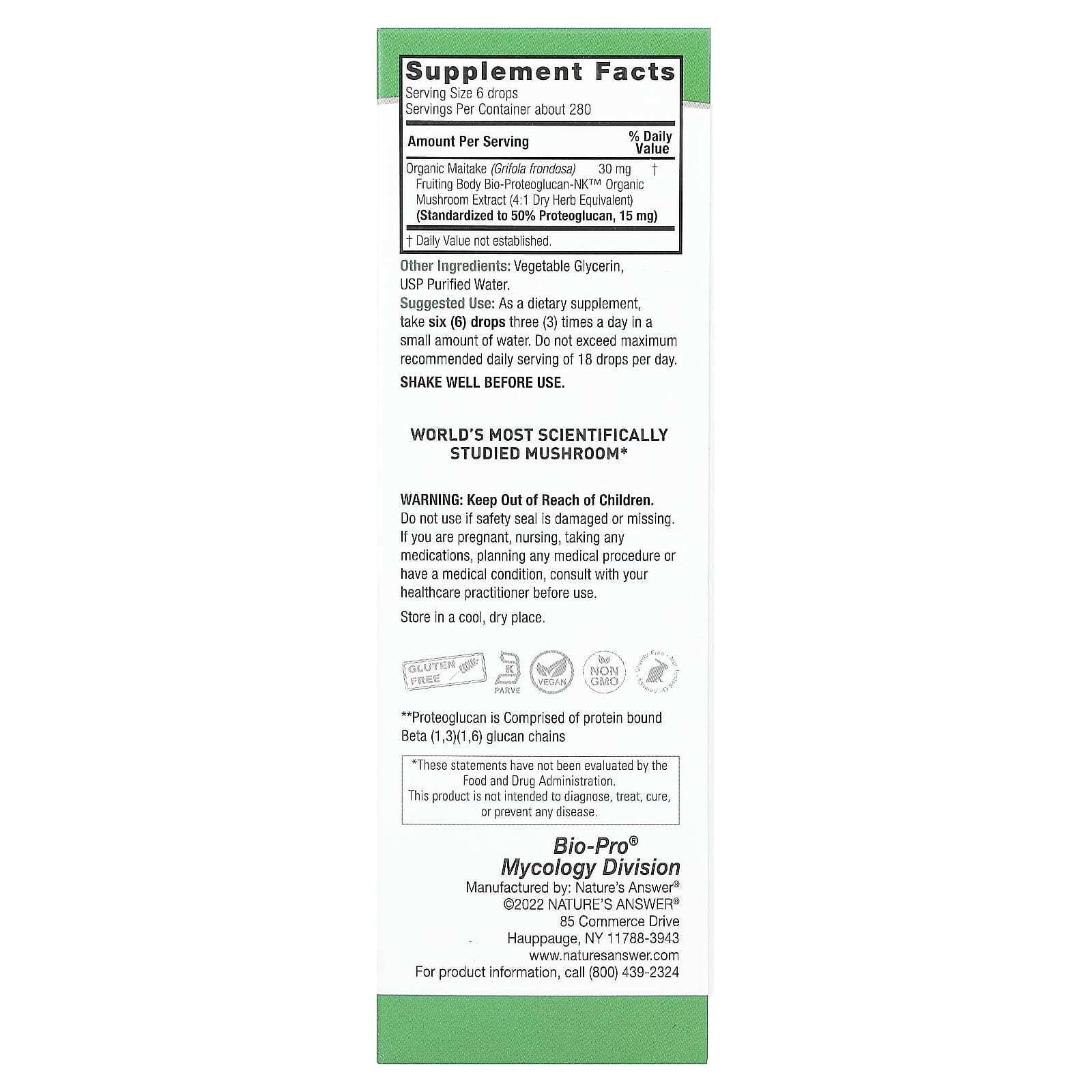 Компания Bio-Pro®, микологическое подразделение Nature's Answer®, уделяет особое внимание предоставлению профессиональных грибных формул премиального качества, отличающихся высочайшим уровнем эффективности и преимуществ для наших покупателей. Наши продукты поставляются непосредственно из источника, на 100% формула и производство на наших современных предприятиях в США, имеющих регистрацию GMP и проходящих контроль качества. Bio-Pro® Bio-Beta-Glucan™ производится из лучших плодовых тел органического гриба-барана, выращенных экологичным способом.