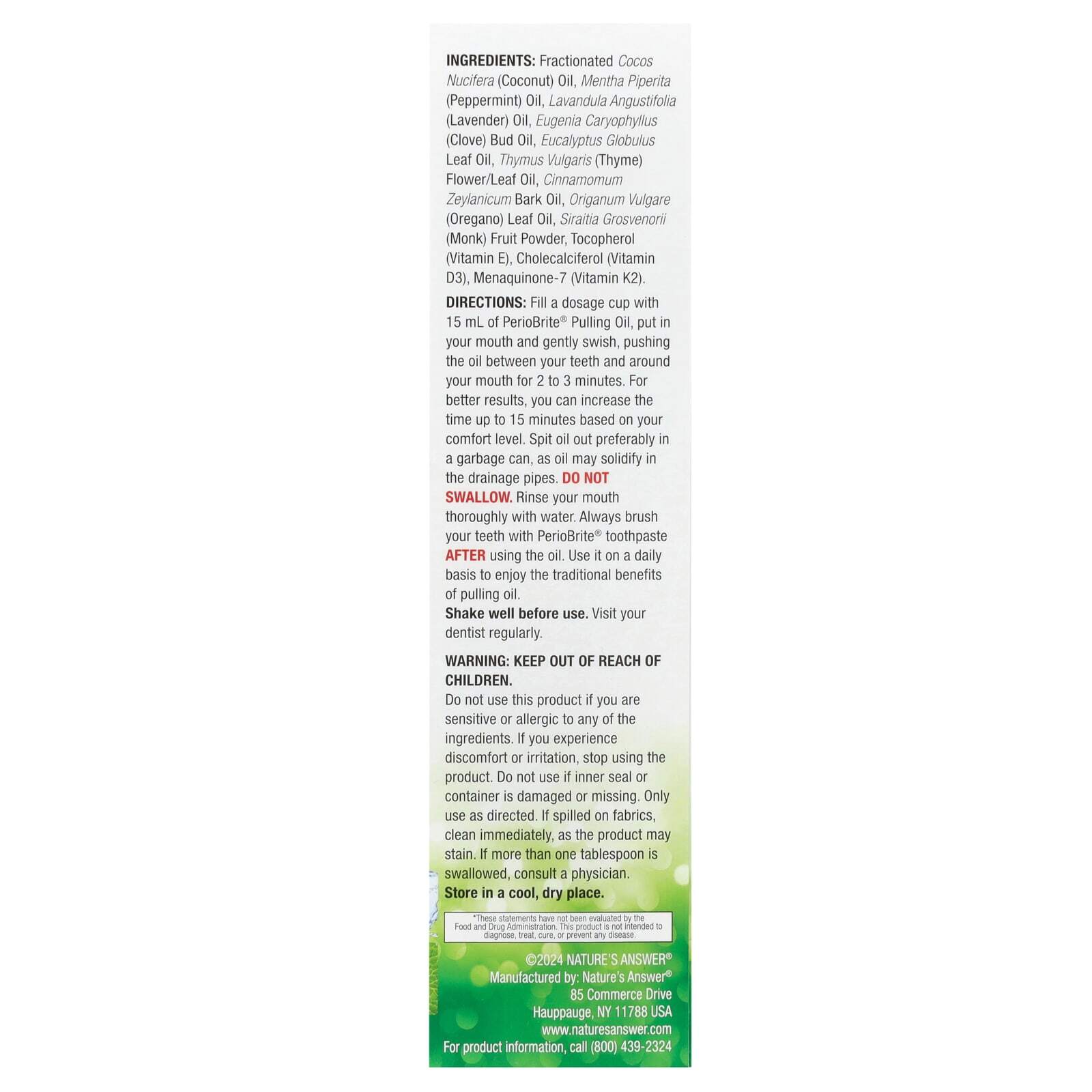 Не глотать. Тщательно прополощите рот водой. Всегда чистите зубы зубной пастой PerioBrite® после использования масла. Используйте его каждый день, чтобы насладиться традиционными преимуществами растительного масла.
