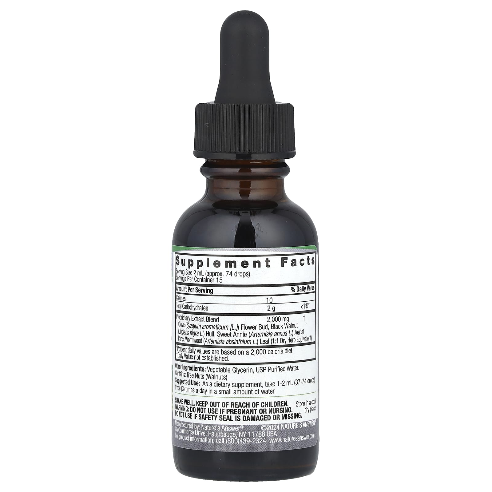 Орех чёрный (Juglans nigra) — дерево, которое растёт в Северной Америке. Урожай с него собирают осенью. Зелёная скорлупа, покрывающая орех, богата таннинами и йодом. Полынь горькая (Artemisia absinthium) — многолетнее кустарниковое растение из семейства астровых. Активные компоненты, содержащиеся в полыни, включают туйон, диоксид кремния, таннины, флавоноиды и инулин. Кроме того, полынь содержит абсинтин и анабсинтин. Комплекс с чёрным орехом и полынью горькой Nature's Answer® предлагает традиционные преимущества этого сочетания трав для улучшения общего состояния здоровья.