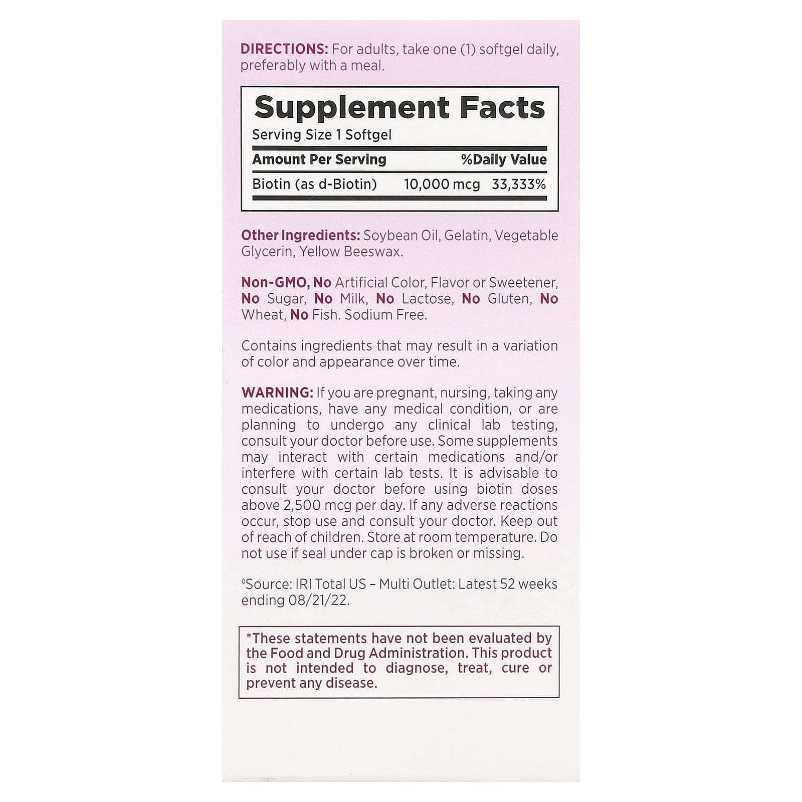 Если вы беременны, кормите грудью, принимаете какие-либо лекарства, страдаете каким-либо заболеванием или планируете пройти какие-либо клинические лабораторные исследования, проконсультируйтесь с врачом перед использованием. Некоторые добавки могут взаимодействовать с определенными препаратами и/или влиять на результаты определенных лабораторных анализов. Перед приемом более 2500 мкг биотина в день рекомендуется проконсультироваться с лечащим врачом. При возникновении любых неблагоприятных реакций следует прекратить прием и обратиться к врачу. Хранить в недоступном для детей месте. Хранить при комнатной температуре. Не следует использовать данный продукт, если пленка под крышкой повреждена или отсутствует.