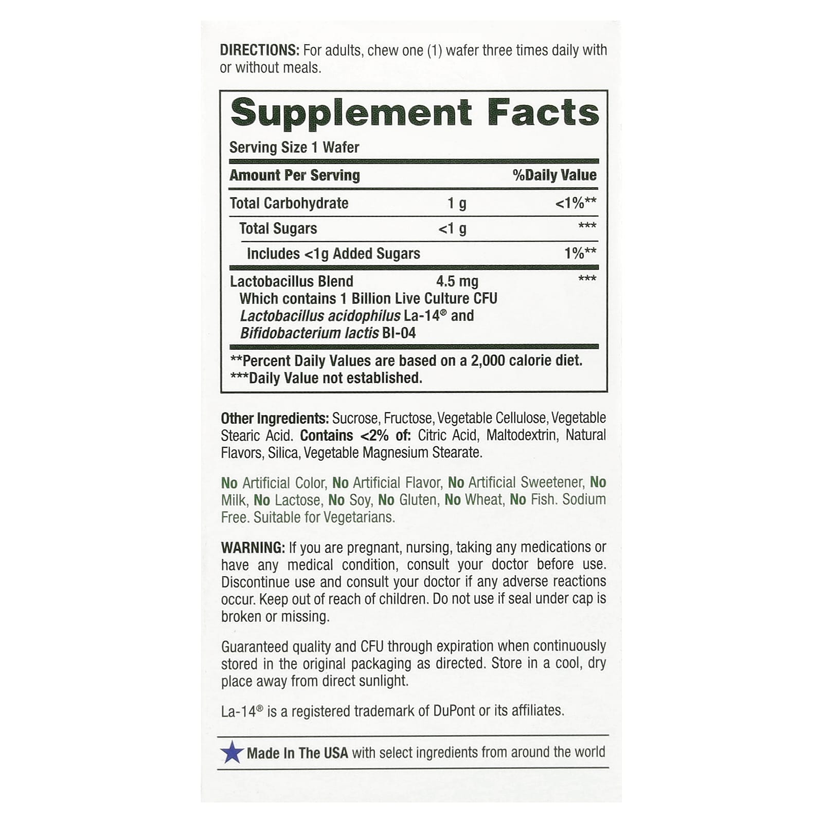 Каждая жевательная вафля без молока со вкусом клубники содержит смесь двух классических штаммов пробиотиков и гарантированно содержит один миллиард живых культур.