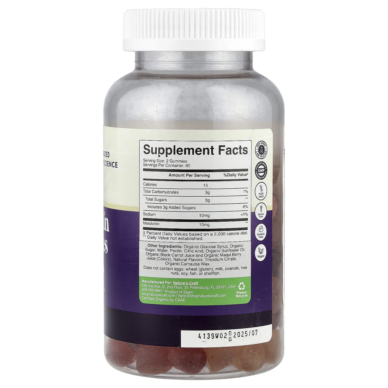 Органическая крахмальная патока, органический сахар, вода, пектин, лимонная кислота, органическое подсолнечное масло, органический сок черной моркови и органический сок ягод маки (красители), натуральные ароматизаторы, тринатриевый цитрат, органический карнаубский воск.