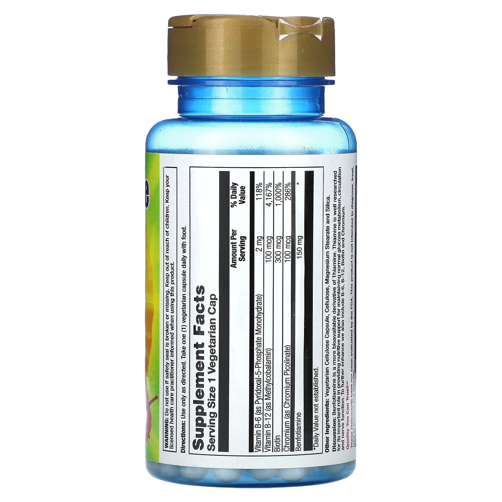 Бенфотиамин — это более биодоступное производное тиамина. Тиамин хорошо изучен, поскольку он обеспечивает питательную поддержку для поддержания нормального метаболизма глюкозы, кровообращения и работы нервной системы. Для дополнительного повышения уровня мы также включаем витамины B6, B12, биотин и хром.