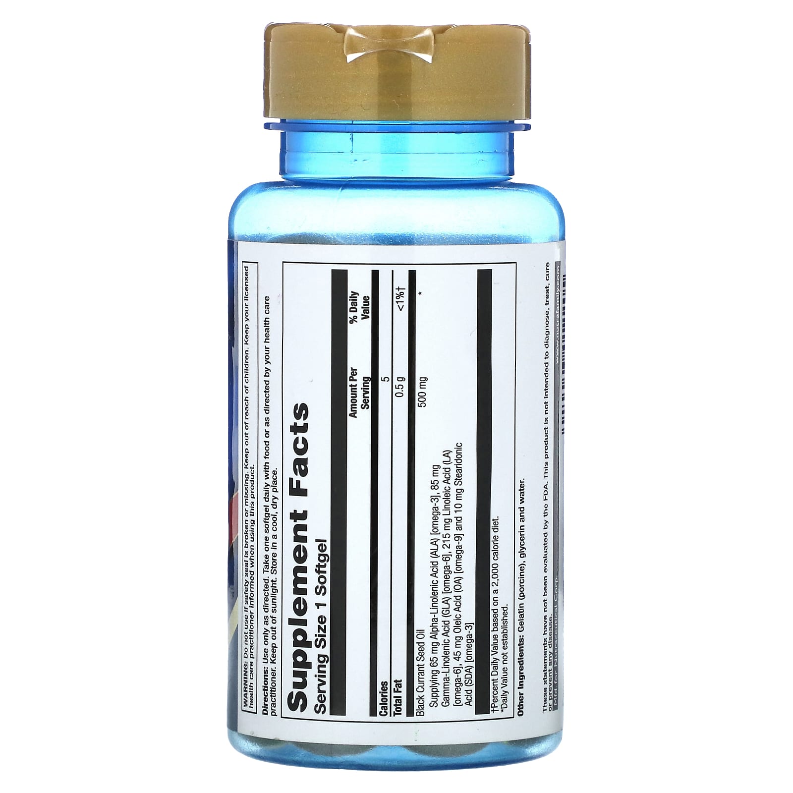 | Масло из семян черной смородины содержит 65 мг альфа-линоленовой кислоты (АЛК) [омега-3], 85 мг гамма-линоленовой кислоты (ГЛК) [омега-6], 215 мг линоленовой кислоты (ЛК) [омега-6], 45 мг олеиновой кислоты (OA ) [омега-9] и 10 мг стеаридоновой кислоты (СДК) [омега-3] | 500 мг | * |