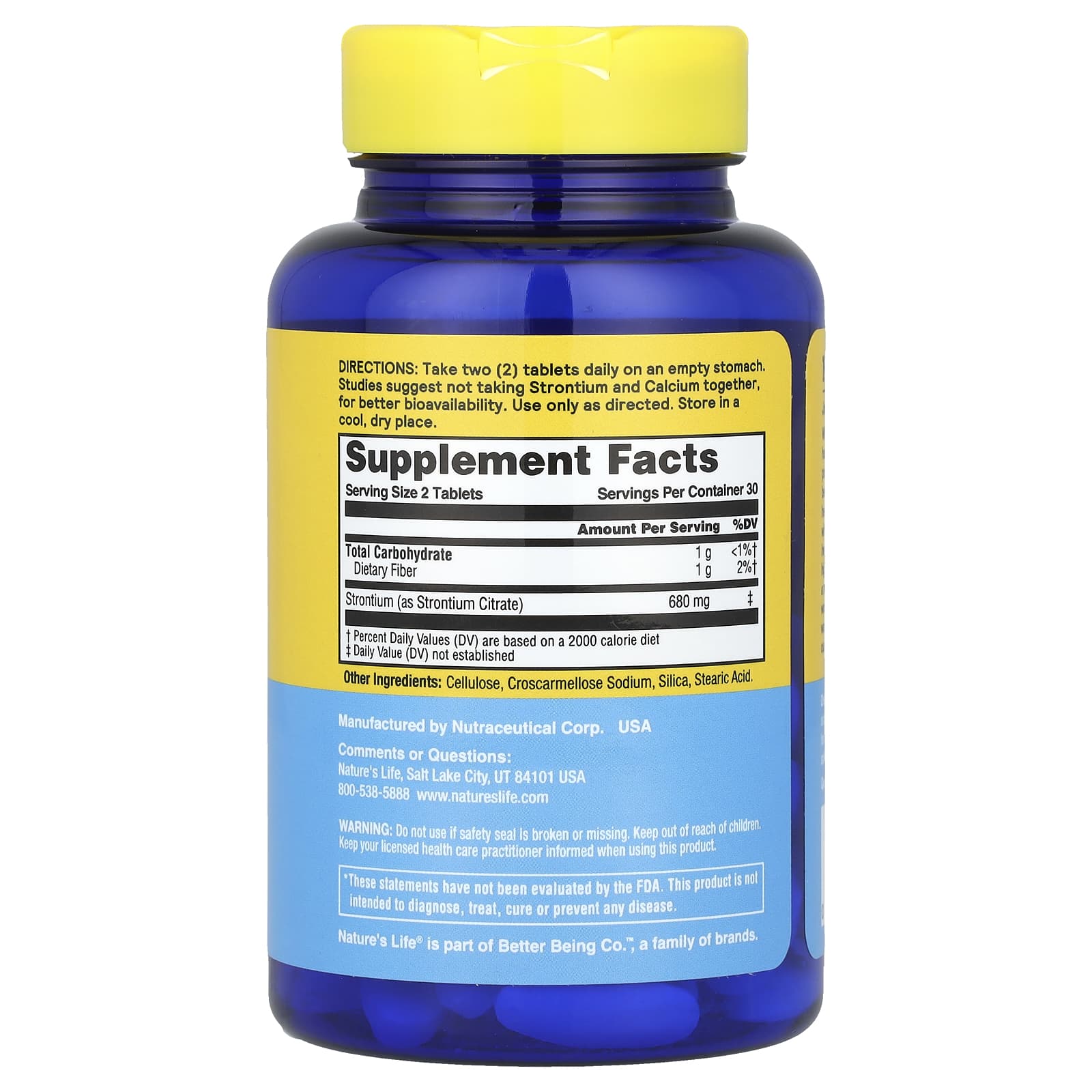 Применять только по прямому назначению. Принимайте две (2) таблеток ежедневно. Исследования показывают, что для лучшей биодоступности стронций следует принимать натощак, отдельно от кальция.