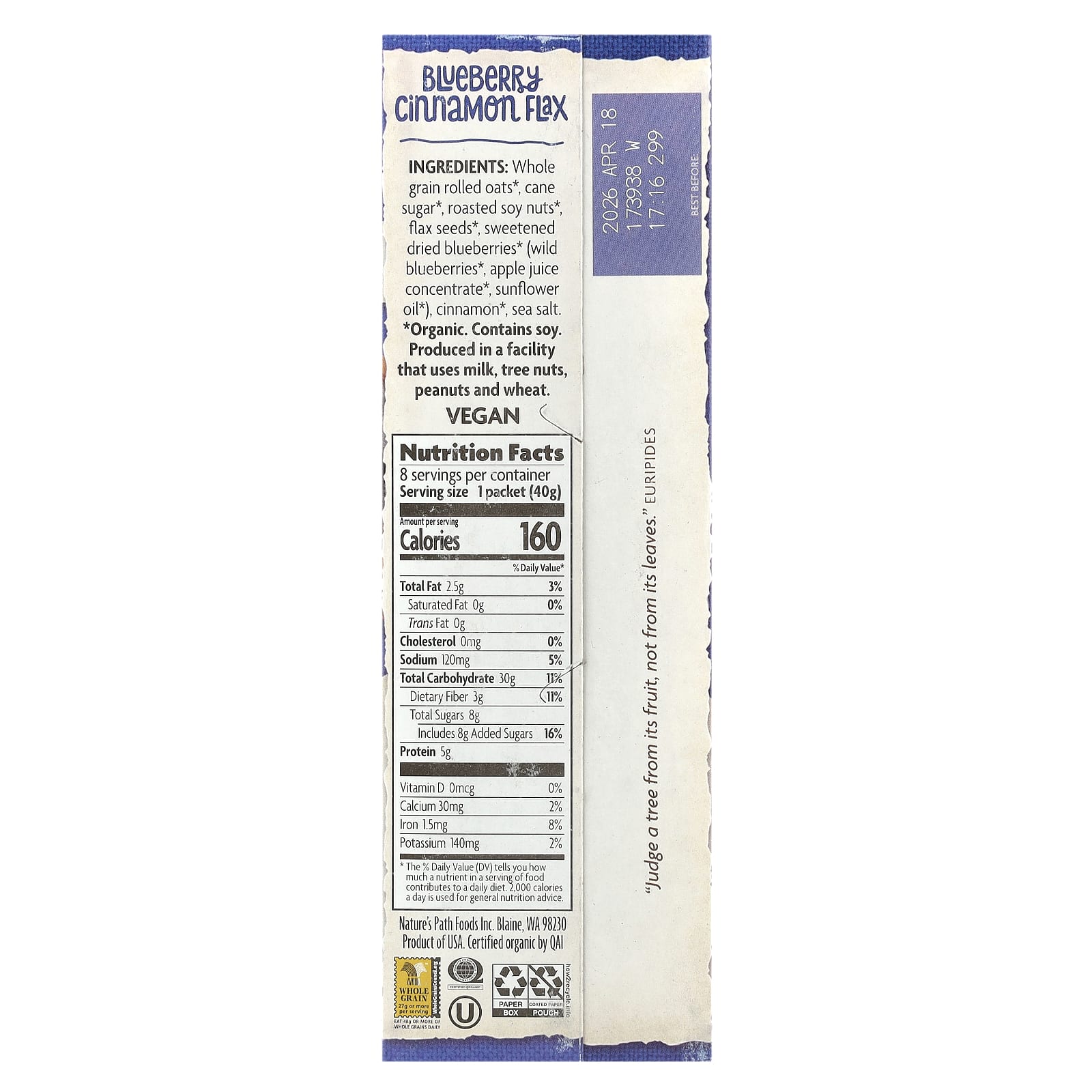 Nature's Path, Органическая овсянка быстрого приготовления, голубика, корица и лен, 8 пакетиков, 320 г (11,3 унции)