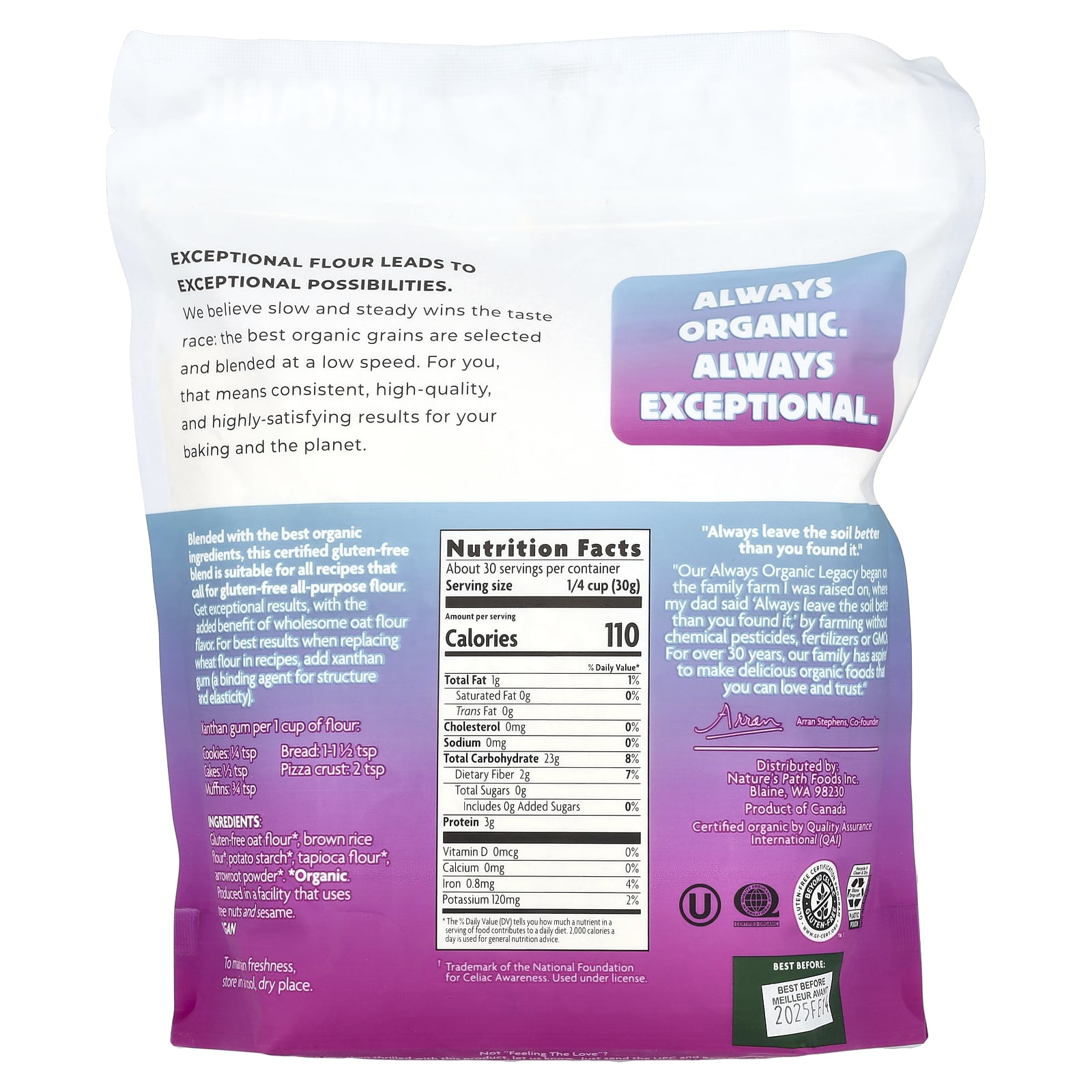 Мы считаем, что в гонке вкусов побеждает медленный и стабильный: лучшие органические зерна отбираются и смешиваются с низкой скоростью. Для вас это означает стабильные, высококачественные и удовлетворительные результаты для вашей выпечки и для всей планеты. Эта сертифицированная безглютеновая смесь, изготовленная из лучших органических ингредиентов, подходит для всех рецептов, в которых требуется универсальная мука без глютена.