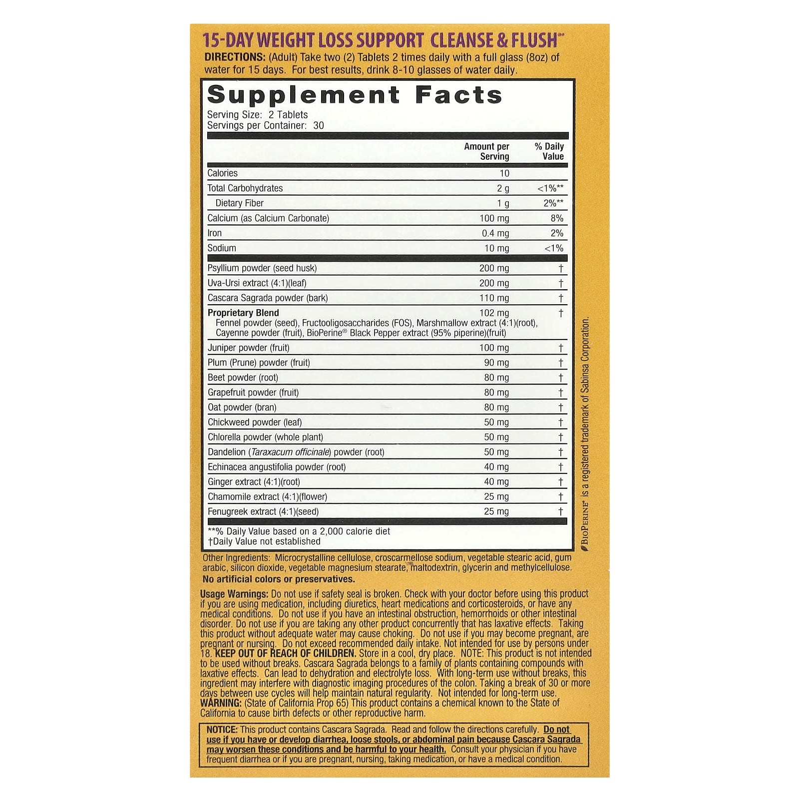 Не следует использовать продукт, если защитная пленка повреждена. Проконсультируйтесь с врачом перед использованием этого продукта, если вы принимаете лекарства, в том числе диуретики, сердечные препараты и кортикостероиды, или имеете какие-либо заболевания. Не используйте, если у вас кишечная непроходимость, геморрой или другое кишечное заболевание. Не используйте, если вы одновременно принимаете какой-либо другой продукт, обладающий слабительным действием. Прием этого продукта без достаточного количества воды может вызвать удушье. Не используйте, если вы планируете беременность, беременны или кормите грудью. Не превышайте рекомендуемую суточную дозу. Продукт не предназначен для лиц младше 18 лет. Хранить в недоступном для детей месте. Хранить в сухом и прохладном месте. Примечание. Этот продукт не предназначен для непрерывного использования. Каскара (Cascara Sagrada) принадлежит к семейству растений, содержащих соединения, оказывающие слабительное действие. Может привести к обезвоживанию и потере электролитов. При длительном применении без перерывов этот ингредиент может помешать проведению диагностических процедур, предполагающих визуализацию толстой кишки. Сделайте перерыв в 30 или более дней между курсами приема, чтобы сохранить естественную регулярность стула. Не предназначен для длительного использования.