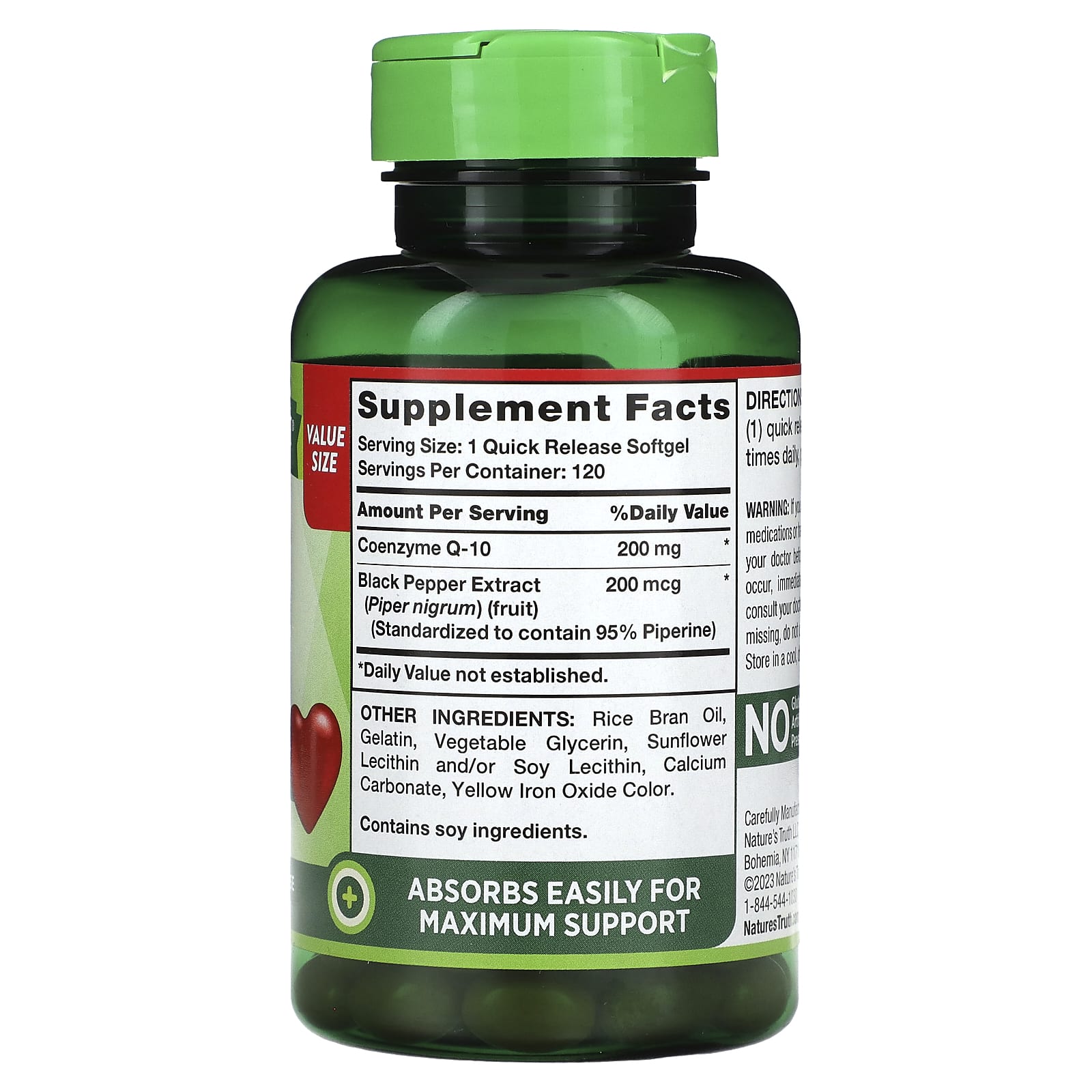 Позаботьтесь о своем сердце с помощью коэнзима CoQ10 от Nature's Truth®!† Коэнзим Q10, известный своей поддержкой здоровья сердца, является важным соединением, которое содержится в каждой клетке организма†. Он может способствовать поддержанию здорового образа жизни и является прекрасным дополнением к любого режима хорошего самочувствия.† Наш высокоэффективный коэнзим Q10, специально разработанный для вашего хорошего самочувствия, содержит 200 мг этого питательного вещества для сердца в одной капсуле с быстрым высвобождением.† Кроме того, наша формула содержит экстракт черного перца для лучшего усвоения.