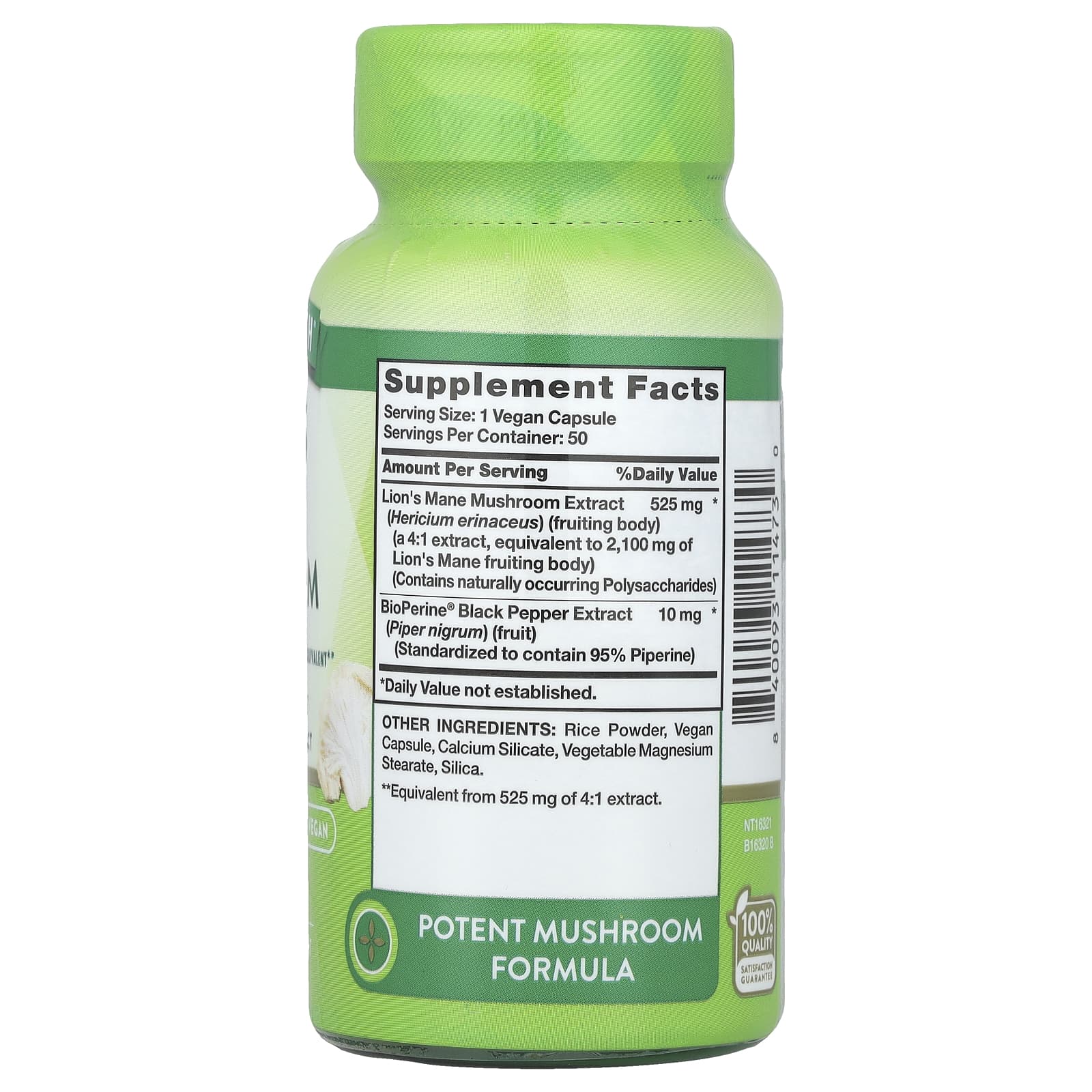 Одна вегетарианская капсула нашего гриба ежовика гребенчатого обеспечивает 2100 мг продукта, полученного из плодового тела грибов Hericium erinaceus, которые содержат полисахариды природного происхождения**. Кроме того, эта формула содержит 10 мг экстракта чёрного перца BioPerine® в каждой порции. Всего одна вегетарианская капсула в день — это всё, что вам нужно.
