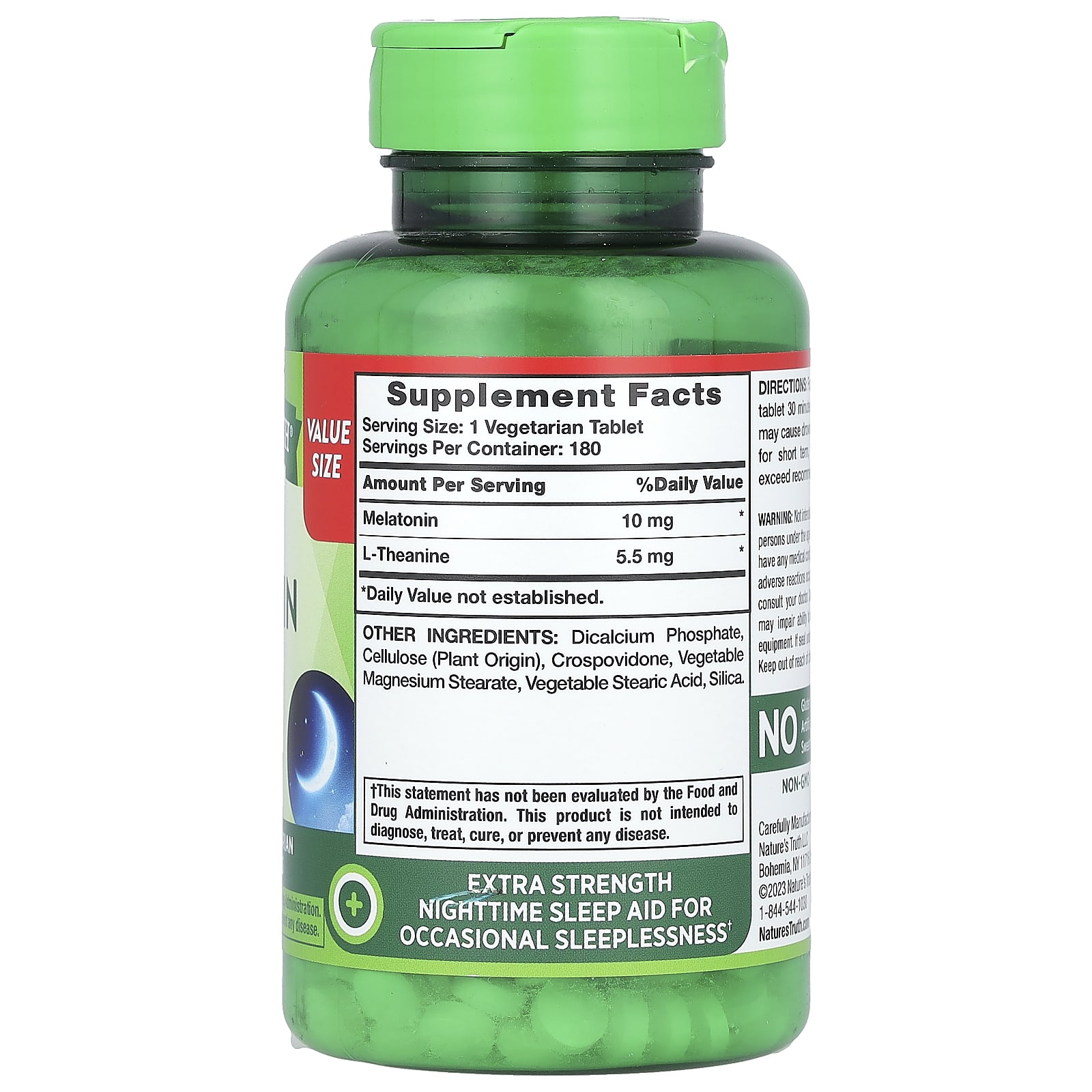 Успокойтеся перед сном с помощью мелатонина Nature's Truth® 10 мг с L-теанином. Просто принять всего одну подходящую для вегетарианцев таблетку перед сном, которая содержит 10 мг мелатонина, снотворного, используемого для ночного сна при периодической бессоннице, и 5,5 мг аминокислоты L-теанина.