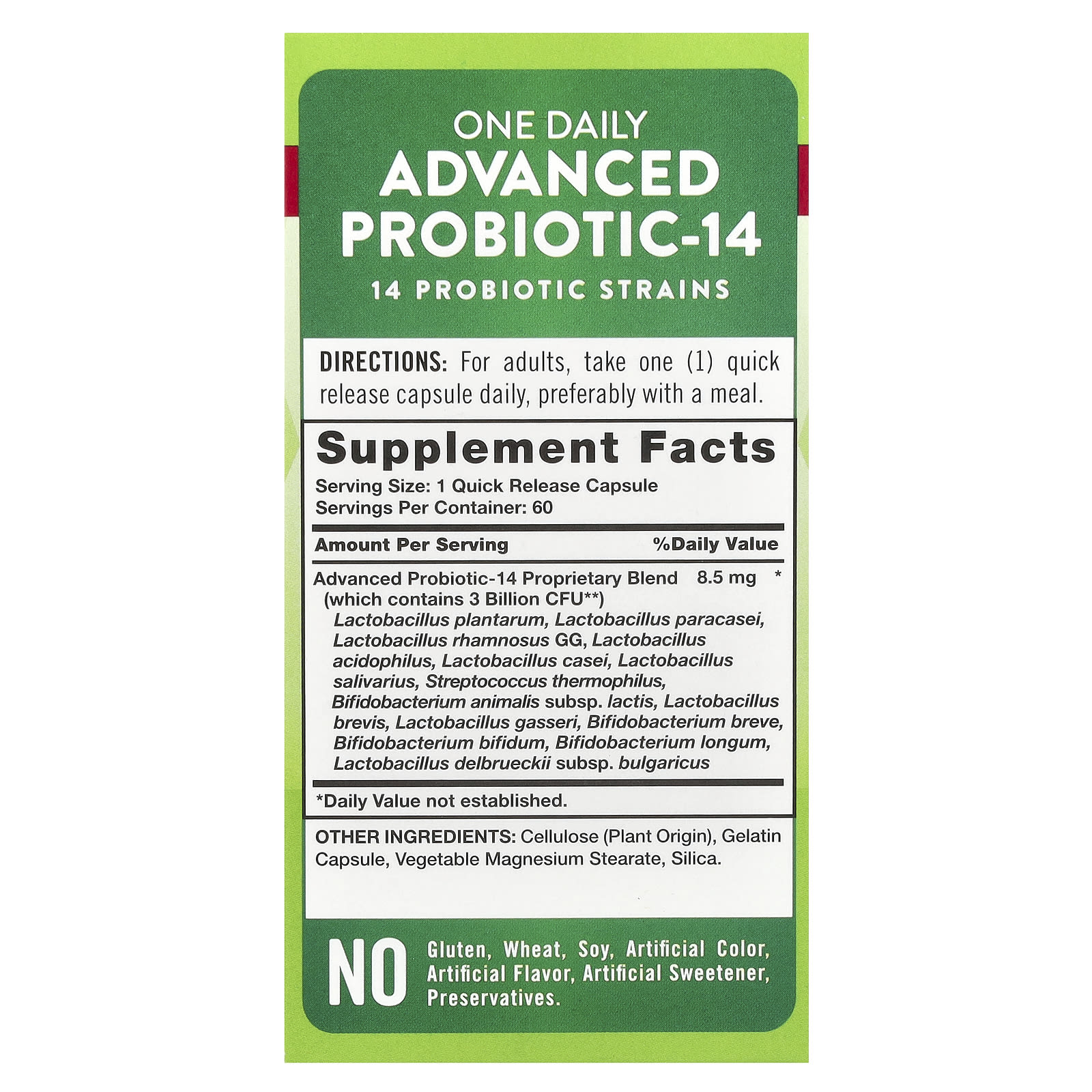 ** Улучшенный пробиотик-14 от Nature's Truth® на момент производства содержит более 3 миллиардов КОЕ (включая натуральный продукт метаболизма, вырабатываемый лактобактериями).