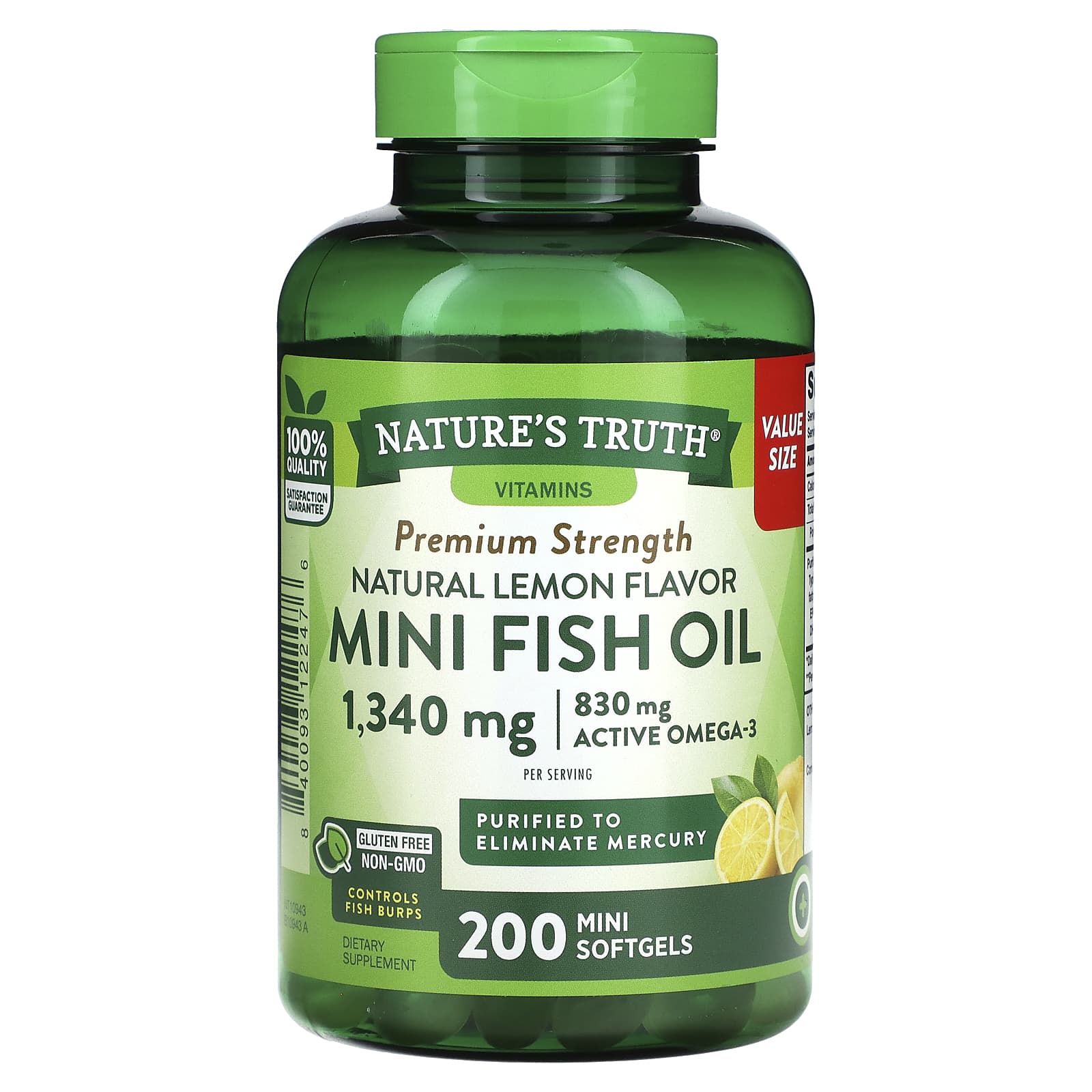 Какой улов! Мини-капсулы с рыбьим жиром от Nature's Truth® содержат 1340 мг очищенного рыбьего жира в 1 порции, включая 830 мг жирных кислот омега-3. Натуральный лимонный ароматизатор в этих мини-капсулах борется с неприятным послевкусием, которое часто возникает после приема рыбьего жира — известным как рыбная отрыжка.
