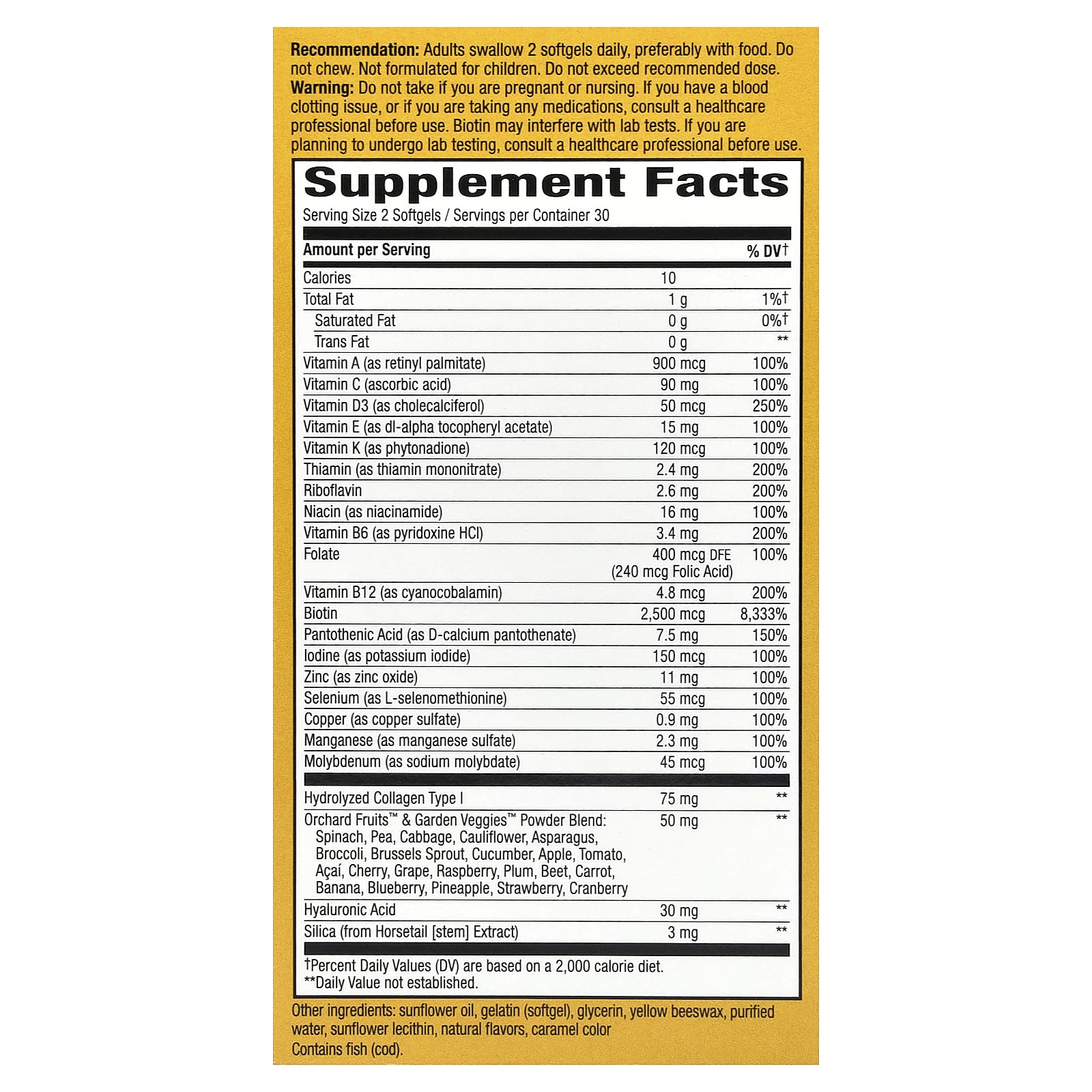 Не принимайте в период беременности или кормления грудью. Если у вас есть проблемы со свертываемостью крови или вы принимаете какие-либо лекарства, перед применением проконсультируйтесь с медицинским работником. Биотин может повлиять на результаты лабораторных тестов. Если вы планируете пройти лабораторные исследования, проконсультируйтесь с врачом перед использованием добавки.
