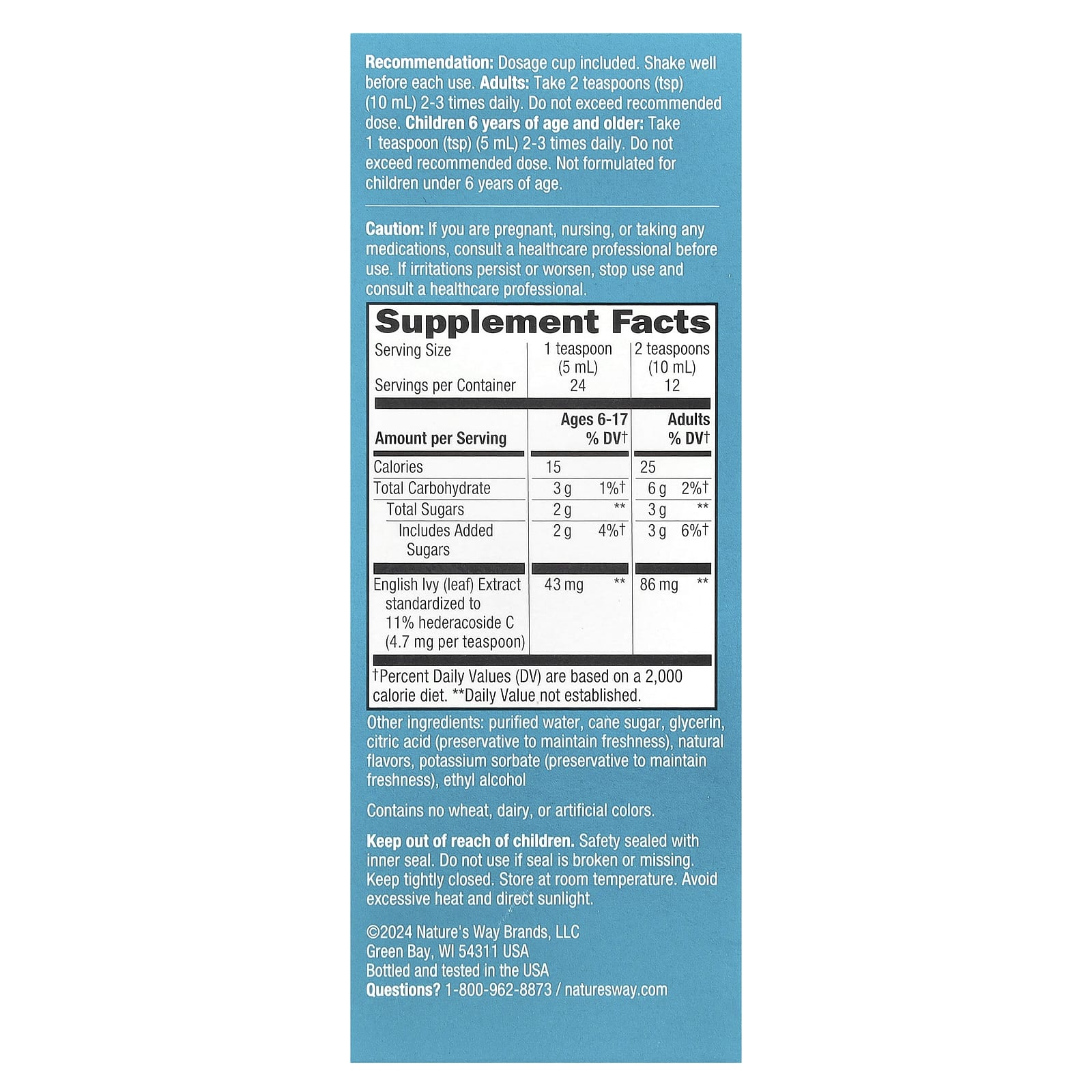| Экстракт листьев английского плюща стандартизирован до 11% гедеракозида C (4,7 мг на чайную ложку) | 43 мг | ** | 86 мг | ** |