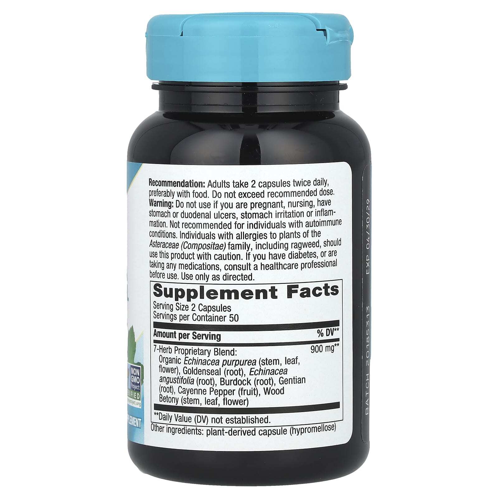 Запатентованная смесь из 7 трав Органическая эхинацея пурпурная (Echinacea purpurea) (стебель, лист, цветок), желтокорень (корень), эхинацея узколистная (корень), лопух (корень), горечавка (корень), кайенский перец (плод), буквица древесная (стебель, лист, цветок) | 900 мг | ** |