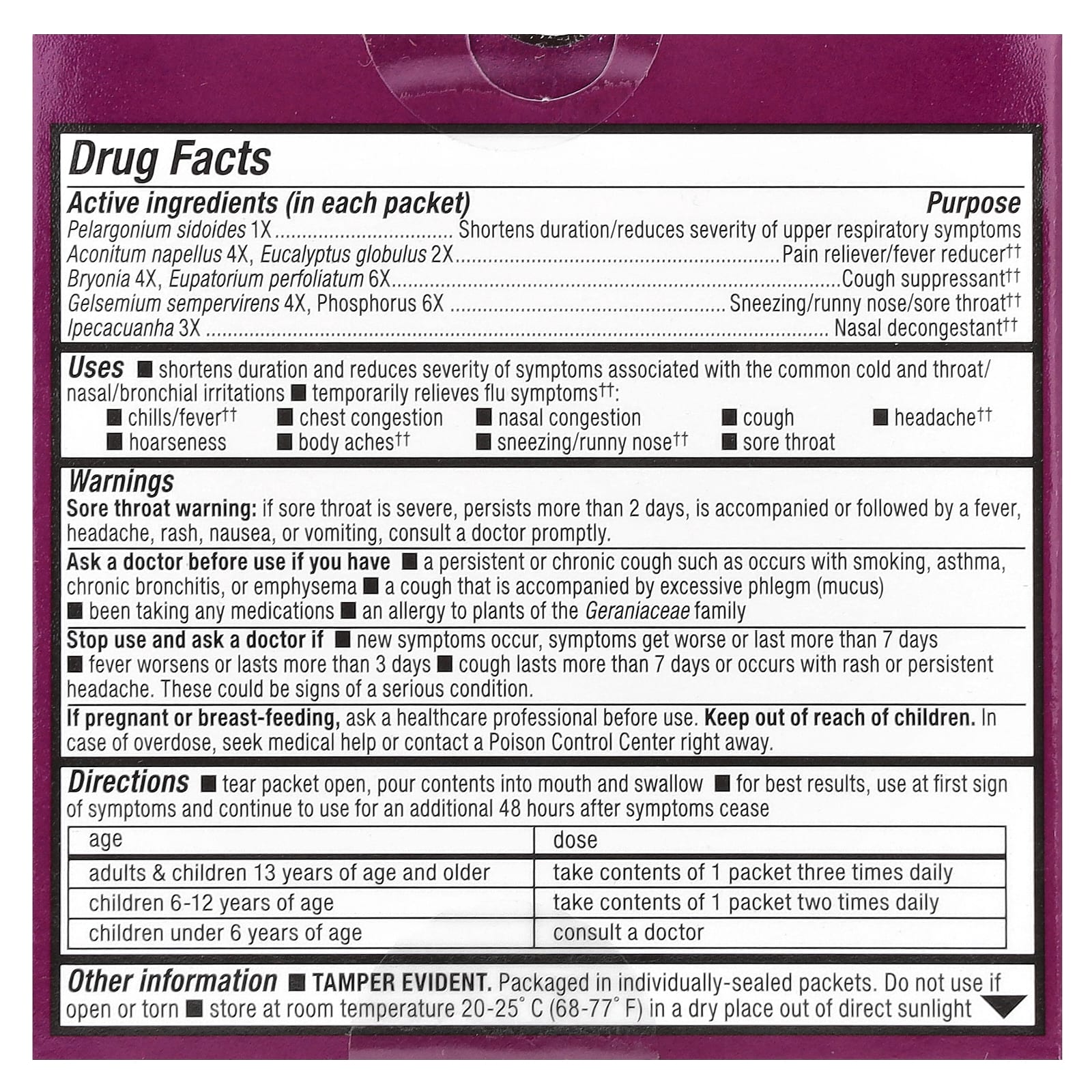 Разорвите пакетик, вылейте содержимое в рот и проглотите. Для достижения наилучших результатов принимайте при возникновении первых симптомов и продолжайте принимать в течение 48 часов после их прекращения.