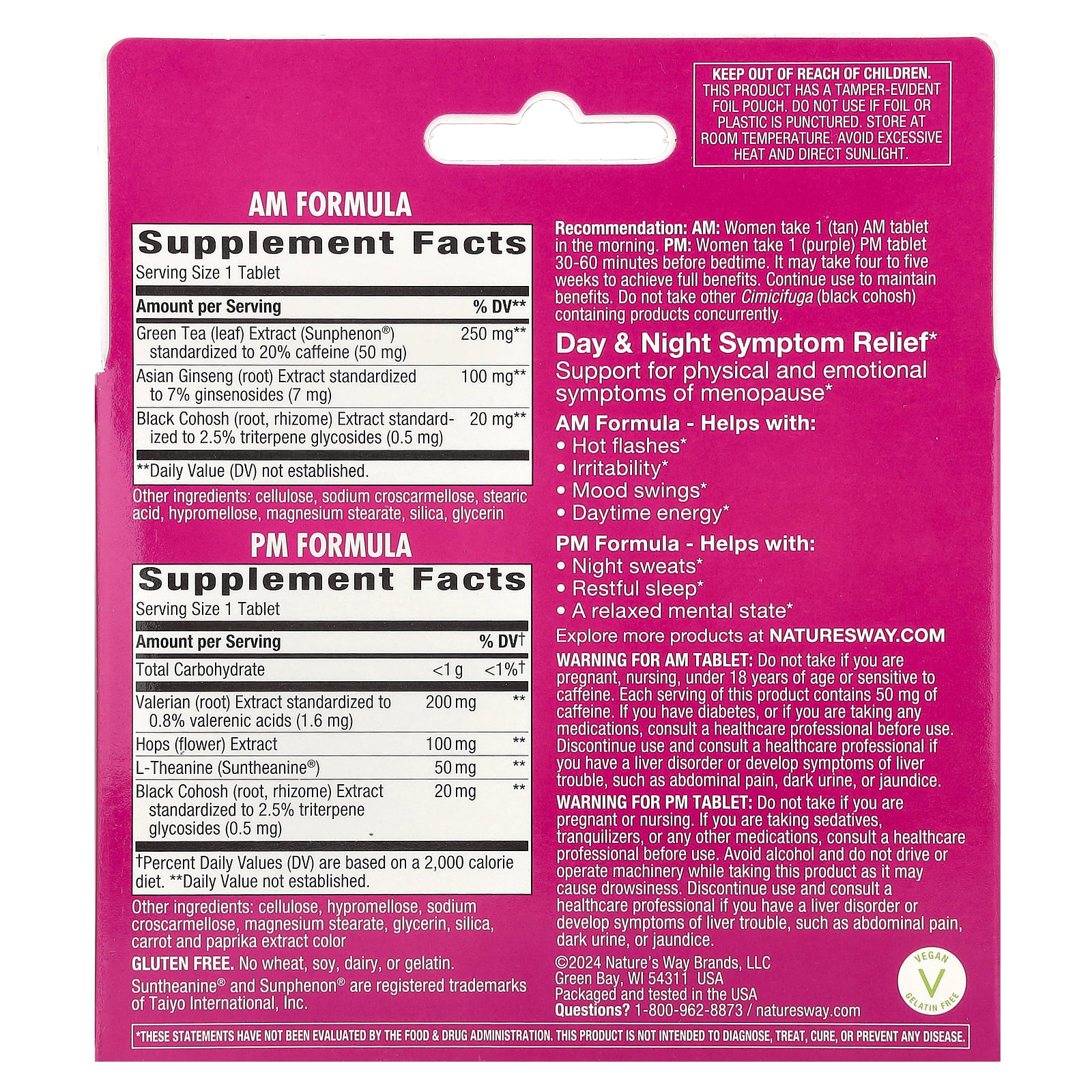 PM: Женщинам принимать по 1 таблетке фиолетового цвета за 30–60 минут до сна. Для достижения полного эффекта может потребоваться от четырех до пяти недель. Продолжайте использовать, чтобы сохранить преимущества. Не принимайте одновременно с другими продуктами, содержащими цимицифугу (Cimicifuga).