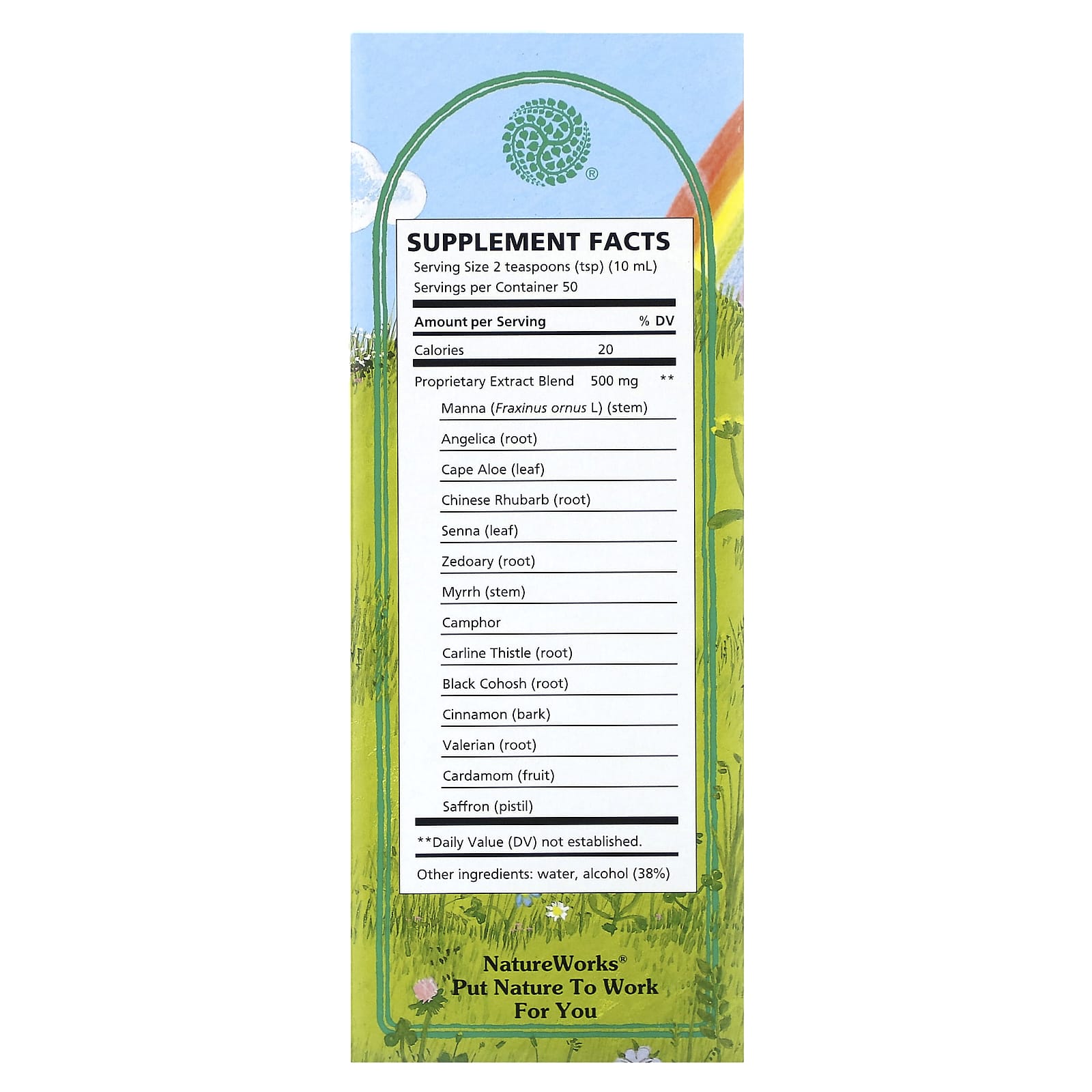 | Proprietary Extract Blend: Manna (Fraxinus Ornus L) (Stem) Angelica (Root) Cape Aloe (Leaf) Chinese Rhubarb (Root) Senna (Leaf) Zedoary (Root) Myrrh (Stem) Camphor Carline Thistle (Root) Black Cohosh (Root) Cinnamon (Bark) Valerian (Root) Cardamom (Fruit) Saffron (Pistil) | 500 mg | ** |