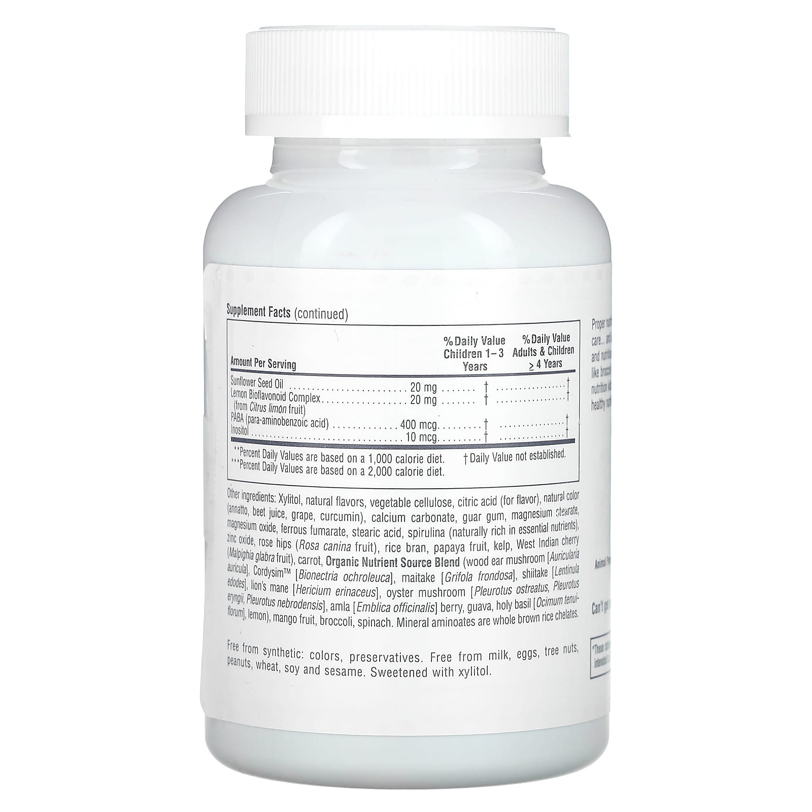Ксилитол, натуральные ароматизаторы (вишня, малина, апельсин и виноград), натуральный краситель (свекольный сок, аннато, куркумин, виноград), растительная целлюлоза, лимонная кислота, карбонат кальция, гуаровая камедь, стеарат магния, оксид магния, стеариновая кислота, фумарат железа, спирулина (от природы богатая необходимыми питательными веществами), оксид цинка, цитрат калия, плоды шиповника (Rosa canina), цельный коричневый рис, папайя, йодид калия, плоды барбадосской вишни (Malpighia glabra), морковь, плоды манго, брокколи, шпинат, смесь органических питательных веществ (древесный гриб [Auricularia auricula], Cordysim™ [Bionectria ochroleuca], гриб-баран [Grifola frondosa], шиитаке [Lentinula edodes], вешенка [Pleurotus ostreatus], P. nebrodensis, P. eryngii], ежовик гребенчатый [Hericium erinaceus], ягоды амлы [Emblica officinalis], гуава, базилик тонкоцветный [Ocimum tenuiflorum], лимон). Минеральные аминоляты — это хелаты из цельного коричневого риса.