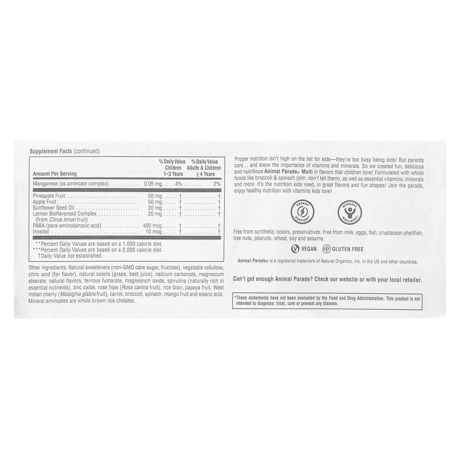 Дети не заботятся о правильном питании — они слишком заняты своими детскими делами. Но родители заботятся и знают о важности витаминов и минералов. Поэтому мы создали забавные, вкусные и питательные мультивитамины Animal Parade® со вкусами, которые нравятся детям! В их состав входят цельные продукты, такие как брокколи и шпинат (тсс, не говорите им об этом), а также необходимые витамины, минералы и многое другое. Это необходимое детям питание с отличным вкусом и в забавной форме! Присоединяйтесь к параду, наслаждайтесь здоровым питанием с витаминами, которые любят дети!