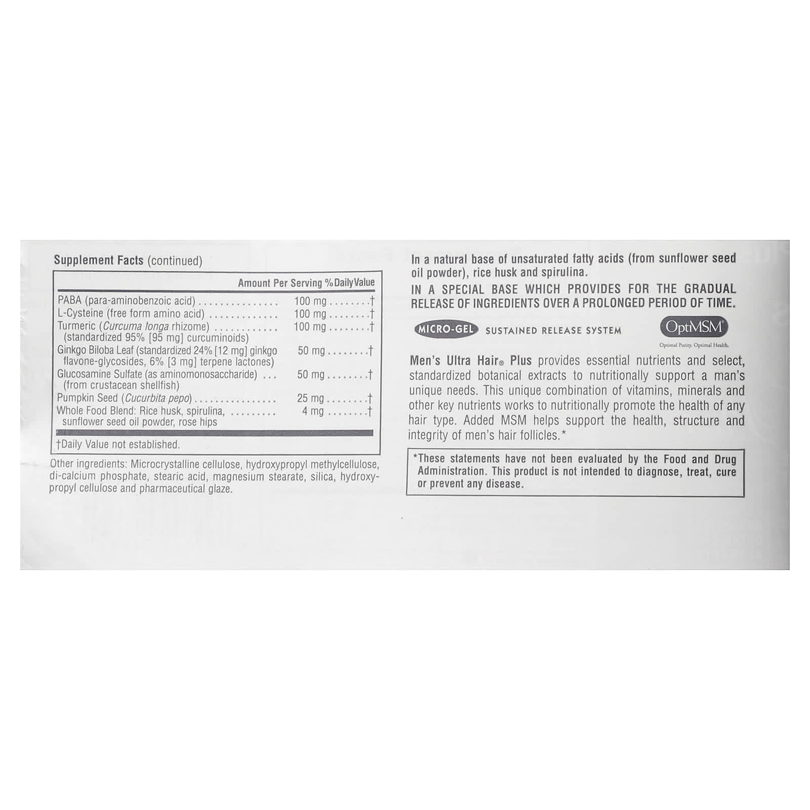 Men's Ultra Hair® Plus содержит необходимые питательные вещества и отборные стандартизированные растительные экстракты для питательной поддержки уникальных потребностей мужчин. Это уникальное сочетание витаминов, минералов и других ключевых питательных веществ способствует здоровью волос любого типа. Добавленный МСМ помогает поддерживать здоровье, структуру и целостность волосяных фолликулов у мужчин.