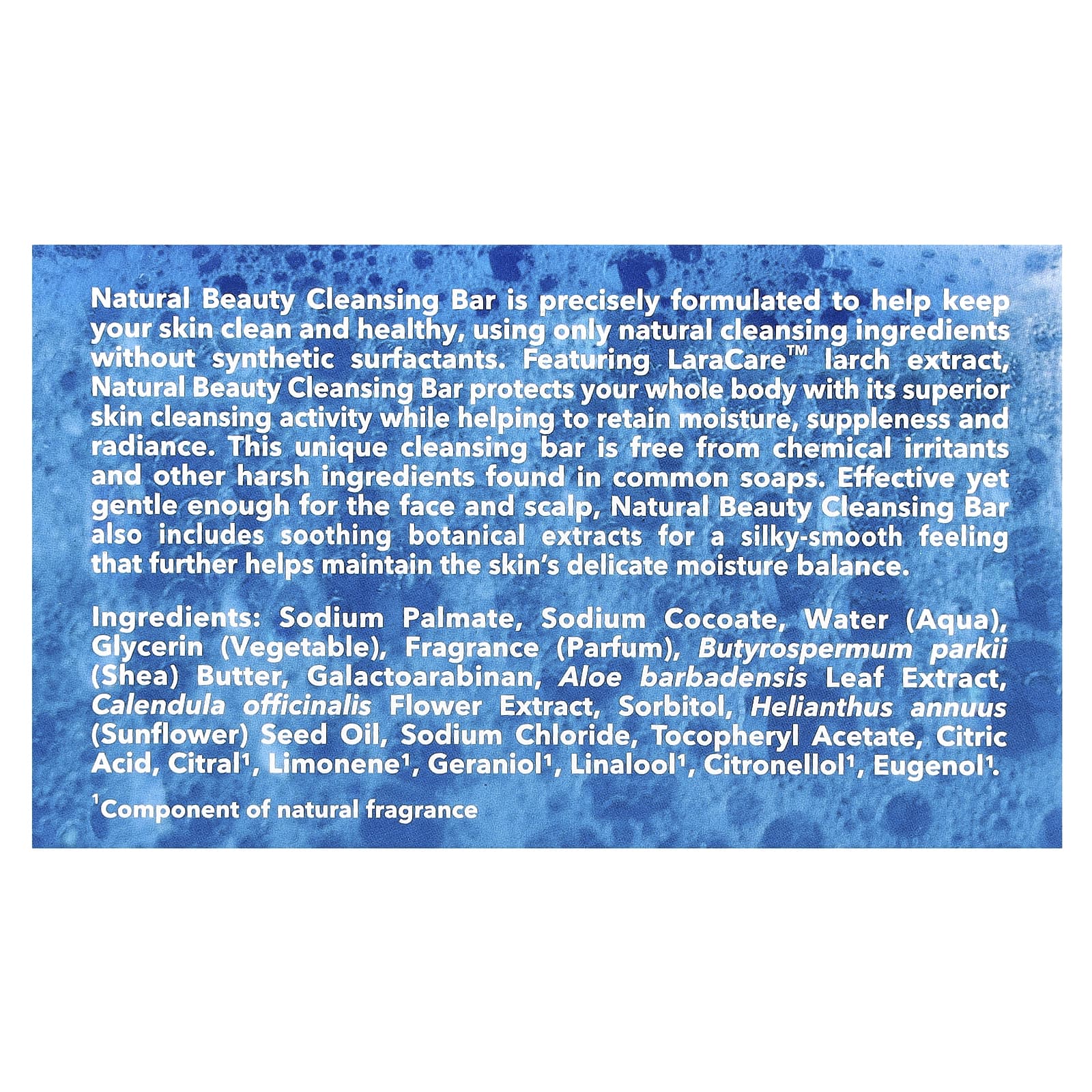 Очищающее мыло «Природная красота» не содержит ПАВ и агрессивных, раздражающих ингредиентов, которые встречаются в обычном мыле (например, каустическая сода, щелочь, жир, гексахлорофен и щелочные металлы). Очищающее мыло «Природная красота» — это уникальное очищающее средство из натуральных органических ингредиентов. При производстве используются влагоудерживающие и смягчающие средства, которые поддерживают деликатный баланс влаги и успокаивают раздраженную кожу. К ним добавлено 500 МЕ витамина Е и аллантоин, обладающий особыми вяжущими и целебными свойствами. Это очищающее средство с особой рецептурой имеет слабокислотную основу (4,5 pH), способствующую поддержанию нормальной «кислотной мантии» тела.