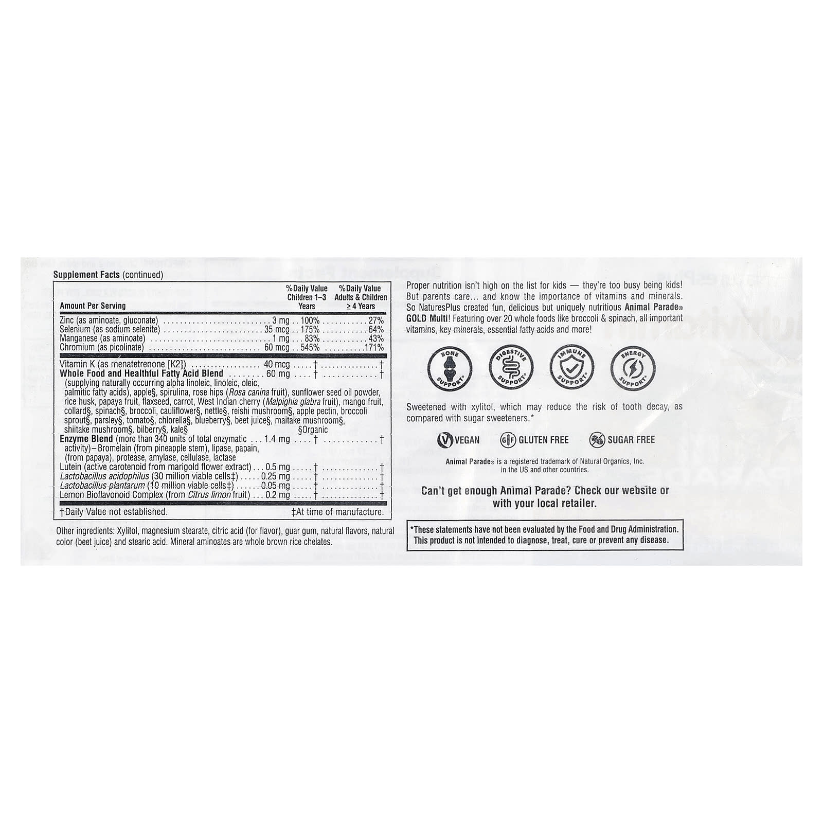 Дети не заботятся о правильном питании — они слишком заняты своими детскими делами.Но родители заботятся и знают о важности витаминов и минералов.Поэтому Natures Plus создала веселые, вкусные и питательные мультивитамины Animal Parade® GOLD Multi!Содержит более 20 цельных продуктов, таких как брокколи и шпинат, все важные витамины, ключевые минералы, незаменимые жирные кислоты и многое другое.