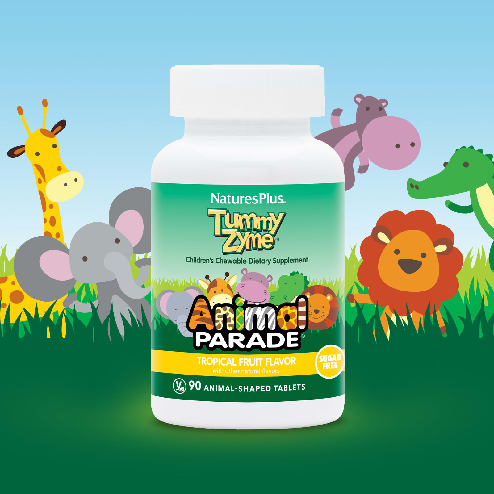 Детские жевательные конфеты Tummy Zyme® Animal Parade® — это полноценная натуральная ферментная добавка для поддержки пищеварения, которую любят дети. Каждая забавная жевательная конфетка в форме животного, обладающая восхитительным вкусом тропических фруктов, содержит высокоактивные пищевые ферменты, которые помогают переваривать и высвобождать белки, углеводы и жиры. Эти мощные, но мягко действующие в желудке пищеварительные ферменты помогают обеспечить поступление полезных питательных веществ из пищевых продуктов в растущий детский организм, улучшая здоровье и пищеварение. Tummy Zyme Animal Parade поддерживает здоровое пищеварение за счет богатой ферментами смеси цельных продуктов и живых пробиотиков.