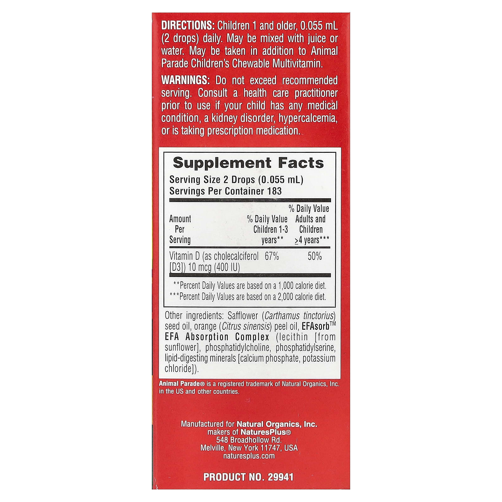 Каждая восхитительная апельсиновая порция витамина D3 в каплях Animal Parade от NaturesPlus® содержит 400 МЕ витамина D3 (холекальциферола) в форме дополнительных питательных веществ, оптимальных для максимального усвоения и использования.