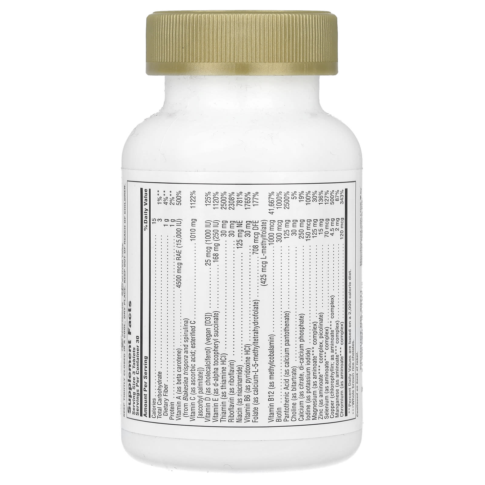 | Витамин А (в виде бета-каротина) (из спирулины и Blakeslea trispora) | 4500 мкг RAE (15000 МЕ) | 500% |
