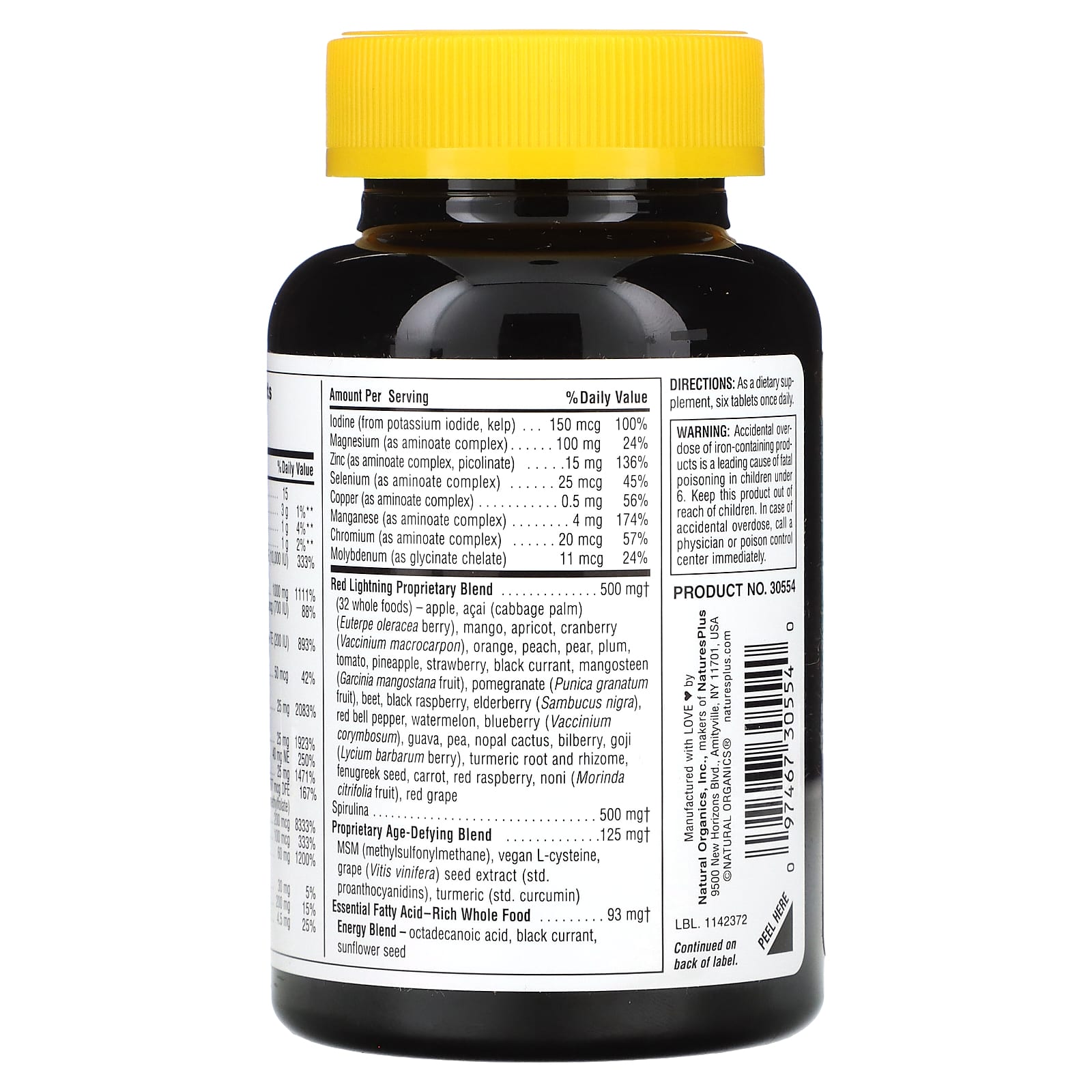 Микрокристаллическая целлюлоза, дикальций фосфат, растительная целлюлоза, оксид магния, многоцветная запатентованная смесь из цельных продуктов Lightning (свекольный сок, чабрец, плоды лимонника (Schisandra chinensis), ягоды бирючины (Ligustrum), ирландский мох [Chondrus crispus], эхинацея узколистная, корень астрагала, кожица винограда, зеленый чай [капуста без кофеина, фруктоолигосахариды [фос], грибы шиитаке, корень одуванчика, семена подсолнечника, абрикос, голубики, кактус, фиолетовая морковь, банан, черная малина, томат, красный сладкий перец, персик, слива, груша, мочевой пузырек (Fucus vesiculosus), хидзики [саргасс фузиформный], комбу [Laminaria setchellii], нори [Porphyra yezoensis], вакаме [Alaria esculenta], хлорелла [Chlorella vulgaris] [разрушенные клетки], исландские водоросли [fucaceae {ascophyllum nodosum], мальпигия гранатолистная, агава, аннато, яблочный уксус, бамбук, свекольная зелень, брокколи, рожковое дерево, семена сельдерея, чиа, корня цикория, корица, цитрусовый пектин, гвоздика, огурец, куркума, фенхель, пажитник, льна, капуста, зеленые кофейные зерна, гибискус, базилика священного (Ocimum tenuiflorum), хмель, хрен, ягода можжевельника, киви, клетчатка корня конжака, корень корейского женьшеня, лемонграсс, плоды оливы, лист орегано, крыжовник, папайя, петрушка, пастернак, горох, фасоль (Phaseolus vulgaris), слива, семена тыквы, ревень, коричневый рис, розмарином, шалфей, листья шпината, красный винный виноград, танжерин, водоросли спирулина [spirulina platensis], красные водоросли [литотамний известковый], тусклая [пальмария пальма], бурые водоросли ламинарии [Luminaria digitata], жеруха, lingonberry, картофель, клюква, яблоко, экстракт черной вишни, ананас, грейпфрут, лимон, клубника, дыня, черная смородина, ежевика, «Маракуйя», финик, фиолетовый инжир, имбирь, артишок, экстракт граната, экстракт белого чая, цветная капуста, чеснок, лук, репа, гуава, апельсин, красная малина, морковь, манго, голубика, бузина (sambucus nigra), ежевика [годжи], нони, гарциния, асаи [капустная пальма] [euterpe oleracea], арбуз), органический тапиока, мальтодекстрин, сульфат цинка, стеарат магния, диоксид кремния, фумарат железа, сульфат марганца, стеариновая кислота.