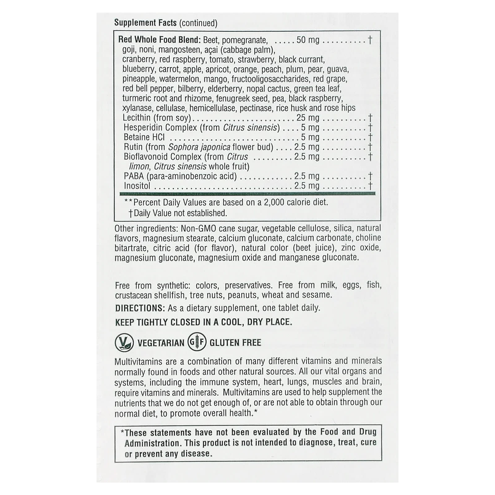 Тростниковый сахар без ГМО, растительная целлюлоза, кремнезем, натуральные ароматизаторы, стеарат магния, глюконат кальция, карбонат кальция, Битартрат холина, лимонная кислота (для аромата), натуральный краситель (свекольный сок), оксид цинка, глюконат магния, оксид магния и глюконат марганца.