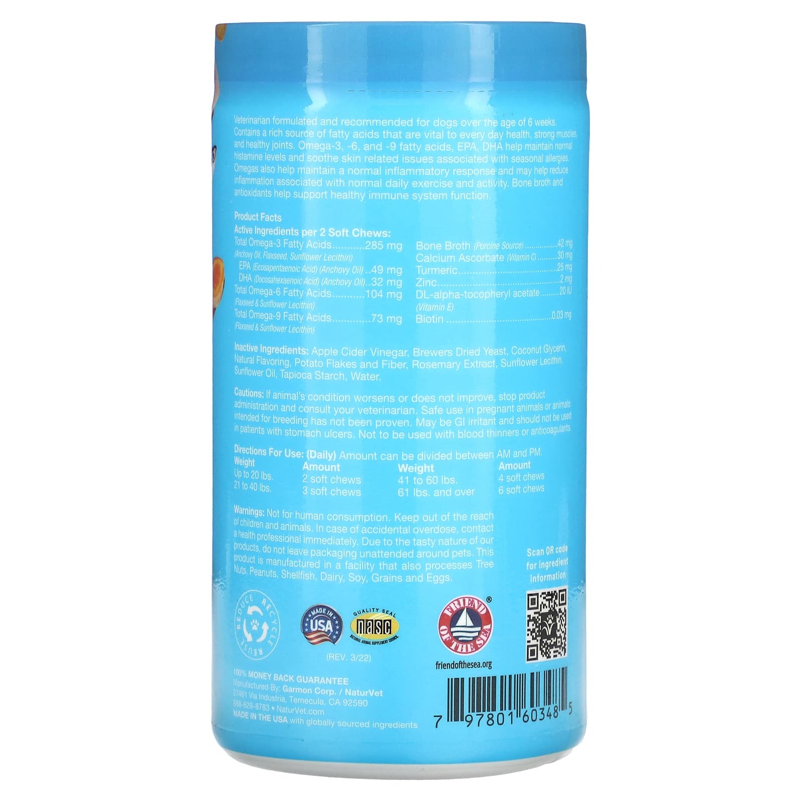 Разработано ветеринаром и рекомендовано для собак старше 6 недель. Содержит богатый источник жирных кислот, которые жизненно важны для повседневного здоровья, укрепления мышц и суставов. Омега-3, -6 и -9 жирные кислоты, ЭПК, ДГК помогают поддерживать нормальный уровень гистамина и устраняют проблемы с кожей, связанные с сезонной аллергией. Омега также помогает поддерживать нормальную воспалительную реакцию и может помочь уменьшить воспаление, связанное с обычными ежедневными упражнениями и физической активностью. Костный бульон и антиоксиданты помогают поддерживать нормальную работу иммунной системы.