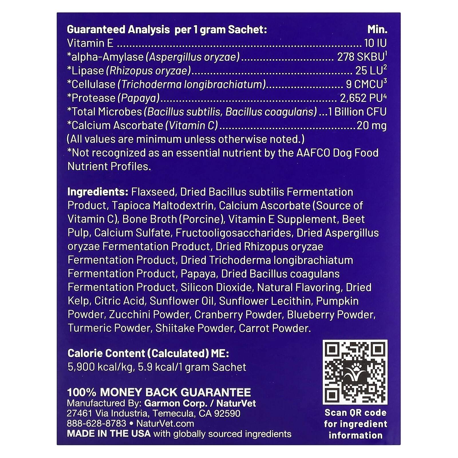 | (Все значения являются минимальными, если не указано иное). * Не признано незаменимым питательным веществом в соответствии с профилями питательных веществ кормов для собак AAFCO. (1) Одна единица SKB - это количество фермента, необходимое для образования 10 мг редуцирующего сахара из 1% раствора растворимого крахмала при pH 5,0 и температуре 40 ºC за 30 минут. (2) Одна единица липазы FCC (LU) определяется как такое количество фермента, которое в условиях анализа высвобождает эквивалент одного моля кислоты (H +) в минуту из субстрата. Анализ основан на пятиминутном гидролизе субстрата из оливкового масла при pH 6,5 и температуре 30 ºС. Жирные кислоты, выделяемые при гидролизе сложных эфиров глицерина, определяют титрованием гидроксидом натрия. (3) Одна единица карбоксиметилцеллюлозы (CMCU) - это количество фермента, которое высвобождает один микромоль восстанавливающего сахара (выраженный в эквиваленте глюкозы) за одну минуту в условиях анализа. (4) Активность папаина измеряется в FCC PU; анализ основан на гидролизе казеина. Этот анализ основан на 60-минутном протеолитическом гидролизе казеинового субстрата при pH 6,0 и температуре 40 ºС. Одна полиуретановая единица (единица папаина) определяется как такое количество фермента, которое высвобождает эквивалент количества тирозина в час в условиях анализа. | |