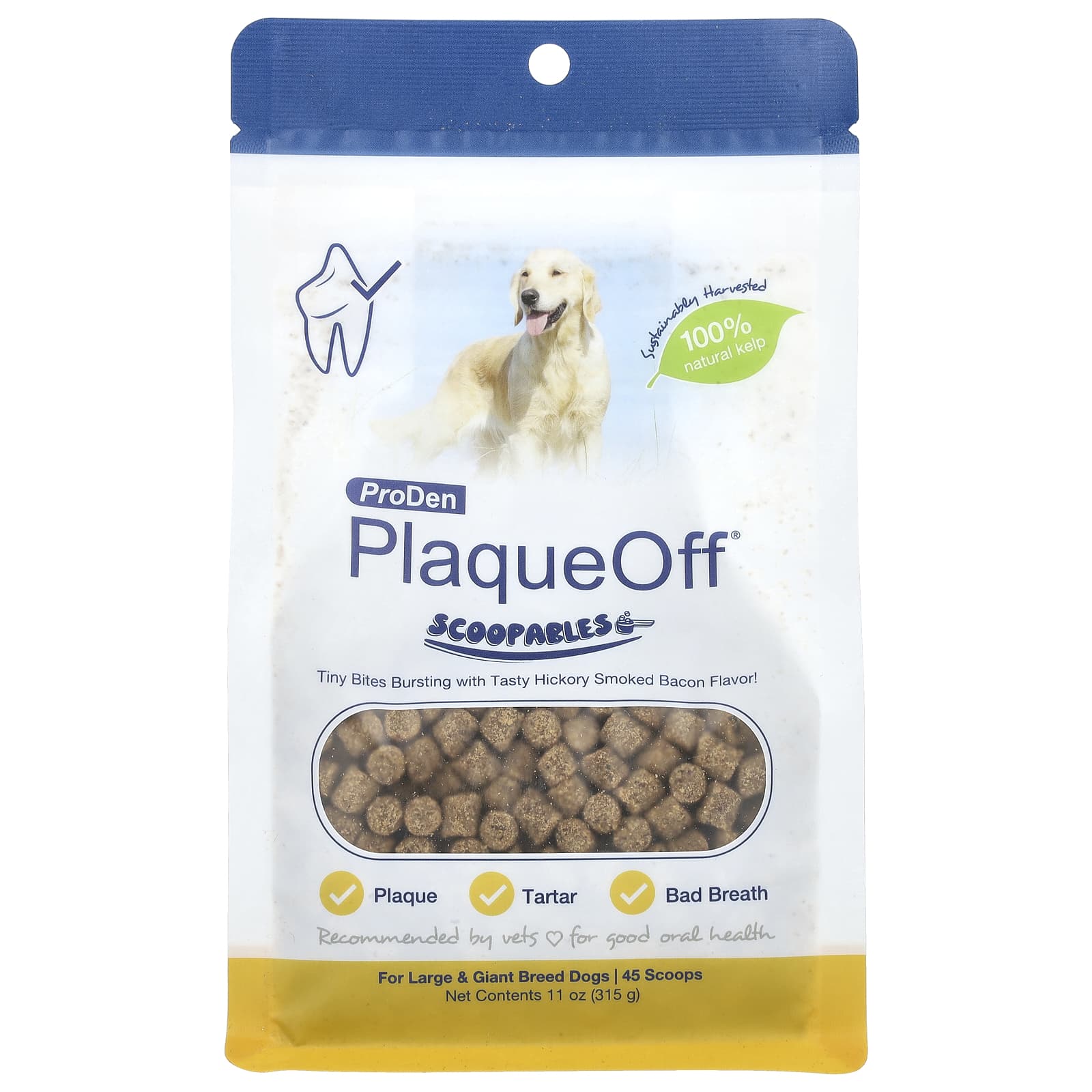 ProDen PlaqueOff® Scoopables are tiny bites packed with tasty hickory smoked bacon flavor. Perfect for finicky eaters and are just as efficacious as our original soft chews. Recommended to support healthy teeth, gums, and breath odor for large & giant breed dogs. The ProDen PlaqueOff® key ingredient is 100% natural kelp and is sustainably harvested in the clear, cold waters off the Scandinavian coastline. Clinical trials on our kelp have shown to help reduce plaque and tartar while helping to improve bad breath.