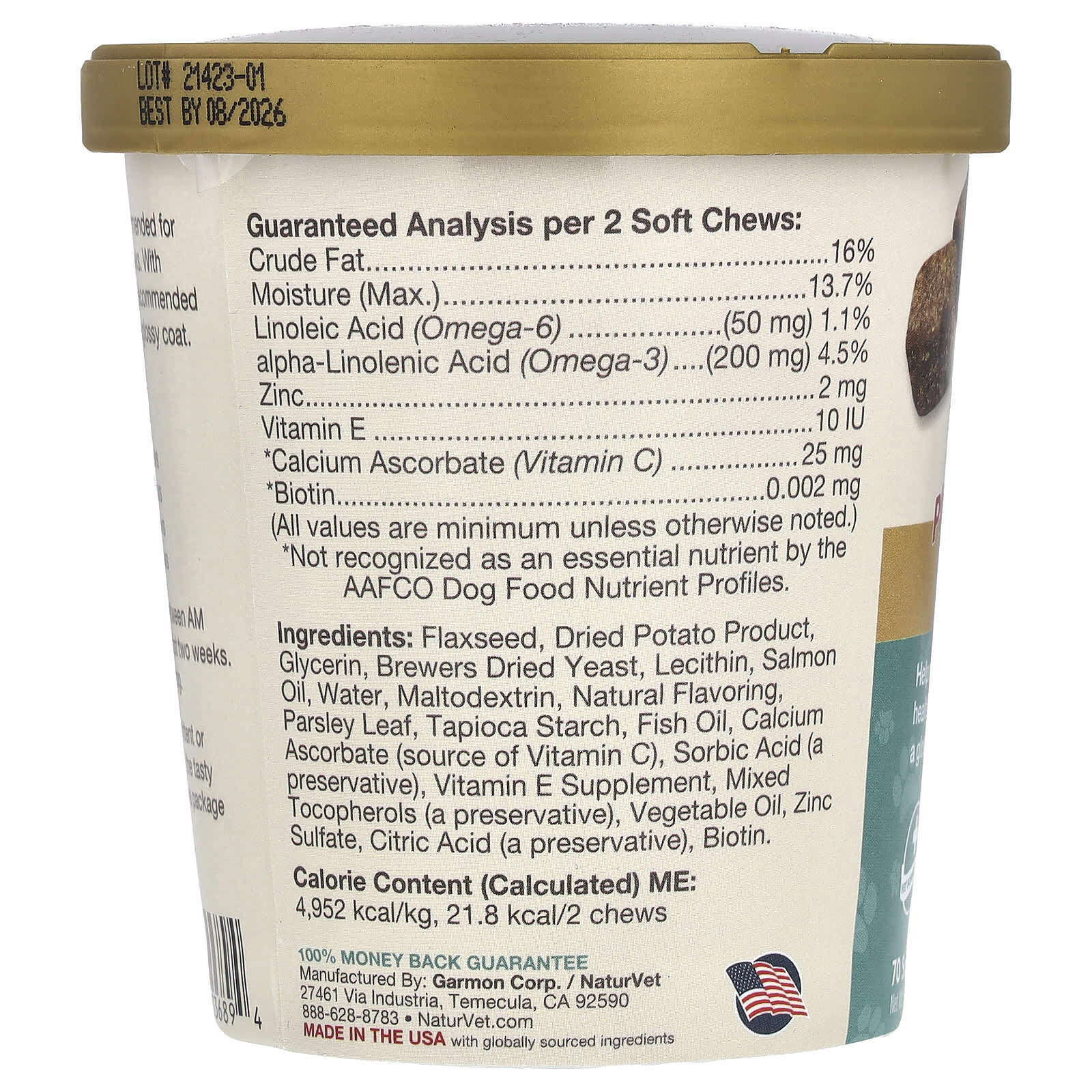 льняное семя, продукт из сухого картофеля, глицерин, сухие пивные дрожжи, лецитин, жир лосося, вода, мальтодекстрин, натуральный ароматизатор, листья петрушки, тапиоковый крахмал, рыбий жир, аскорбат кальция (источник витамина C), сорбиновая кислота (консервант), добавка с витамином Е, смешанные токоферолы (консервант), растительное масло, сульфат цинка, лимонная кислота (консервант), биотин.
