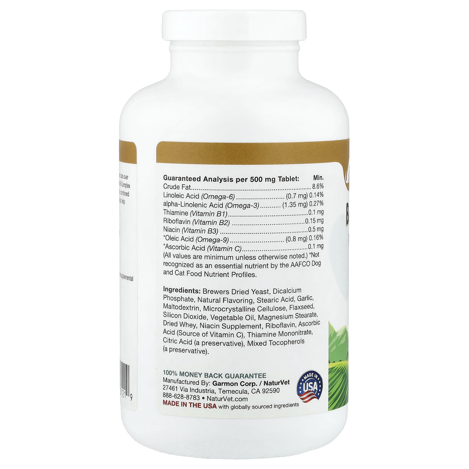 сухие пивные дрожжи, дикальций фосфат, натуральный ароматизатор, стеариновая кислота, чеснок, мальтодекстрин, микрокристаллическая целлюлоза, льняное семя, диоксид кремния, растительное масло, стеарат магния, сухая сыворотка, добавленный ниацин, рибофлавин, аскорбиновая кислота (источник витамина C), тиамина мононитрат, лимонная кислота (консервант), смешанные токоферолы (консервант).