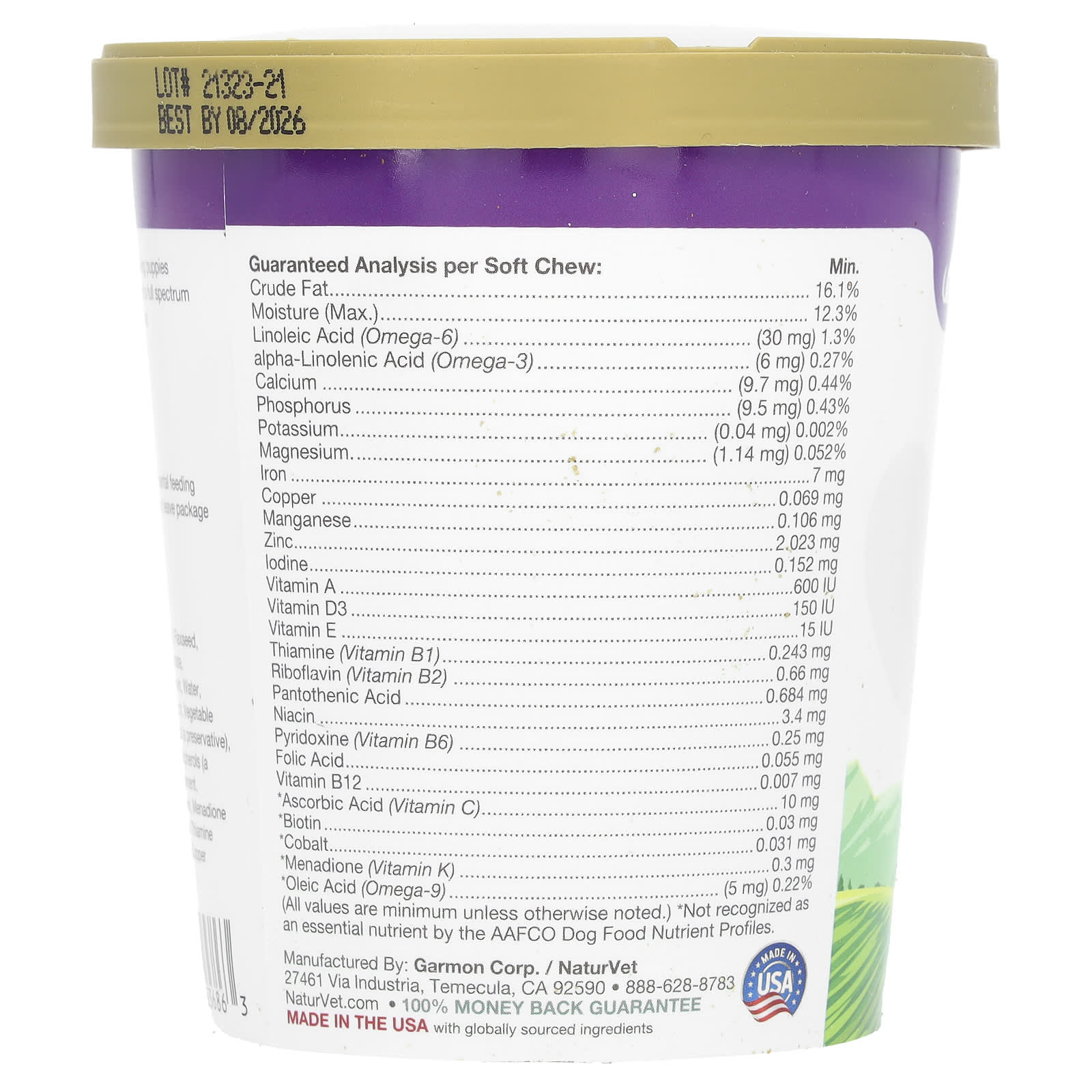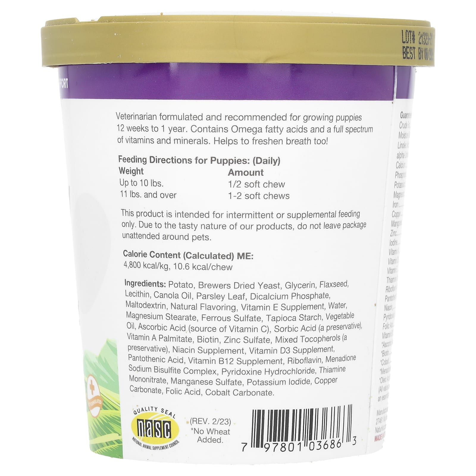 картофель, сухие пивные дрожжи, глицерин, льняное семя, лецитин, рапсовое масло, листья петрушки, дикальций фосфат, мальтодекстрин, натуральный ароматизатор, добавка с витамином Е, вода, стеарат магния, сульфат железа, тапиоковый крахмал, растительное масло, аскорбиновая кислота (источник витамина C), сорбиновая кислота (консервант), витамин A (пальмитат), биотин, сульфат цинка, смешанные токоферолы (консервант), добавленный ниацин, добавка с витамином D3, пантотеновая кислота, добавка с витамином B12, рибофлавин, комплекс менадиона натрия бисульфита, пиридоксина гидрохлорид, тиамина мононитрат, сульфат марганца, йодид калия, карбонат меди, фолиевая кислота, карбонат кобальта.