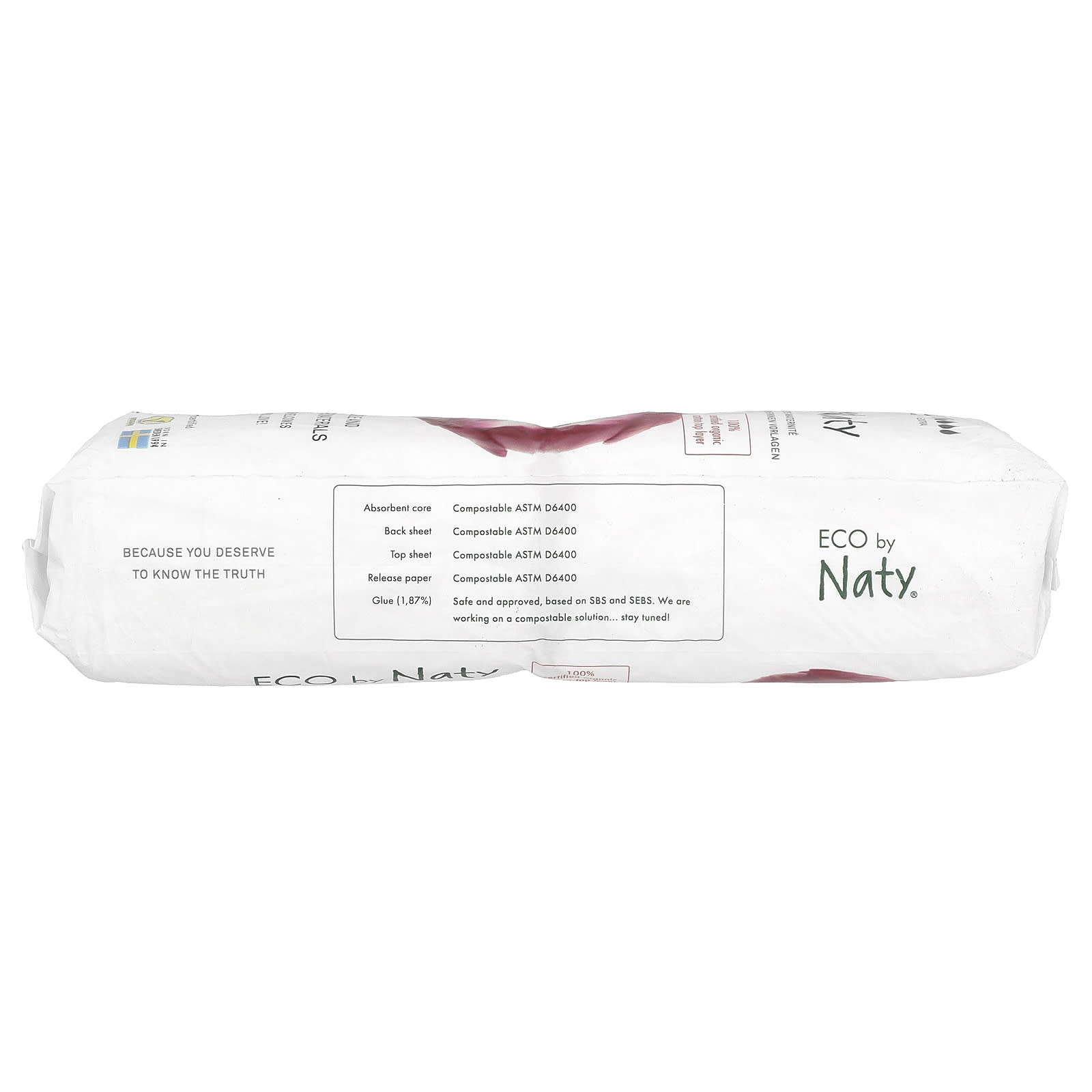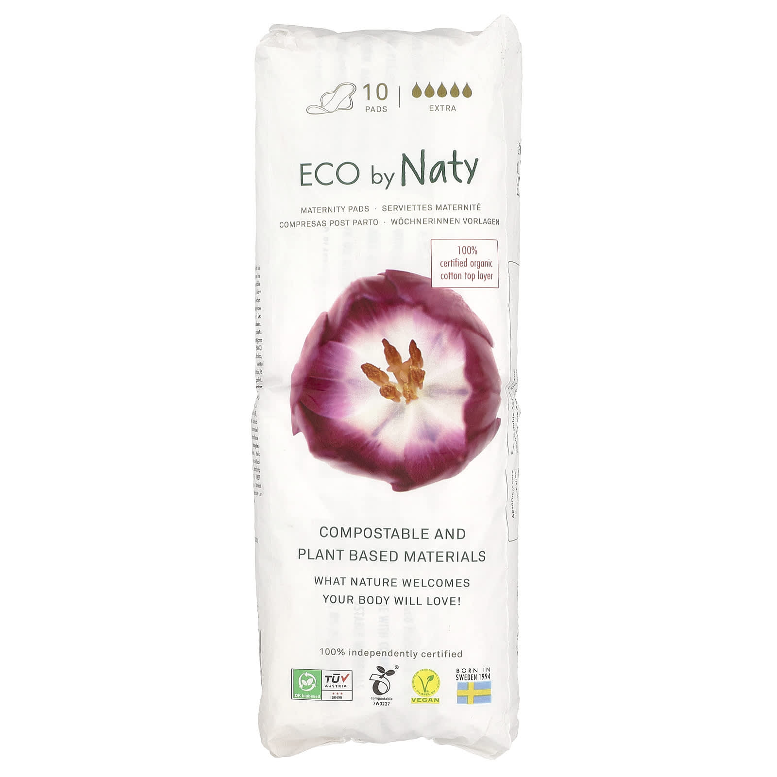 Как эта упаковка, так и обертка прокладок полностью компостируются согласно стандарту ASTM D6400.