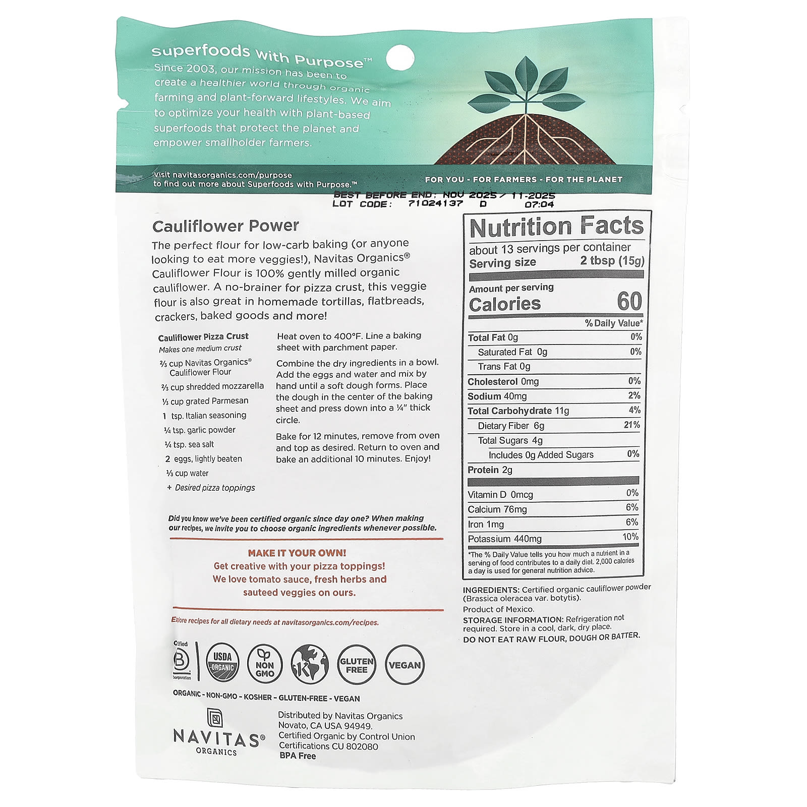 Мука из цветной капусты Navitas Organics® - идеальная мука для выпечки с низким содержанием углеводов (или для тех, кто хочет есть больше овощей!) - это 100% органическая цветная капуста мягкого помола. Эта вегетарианская мука отлично подходит для приготовления корочки для пиццы. Кроме того, она отлично подходит для приготовления домашних лепешек, лепешек, крекеров, выпечки и многого другого!