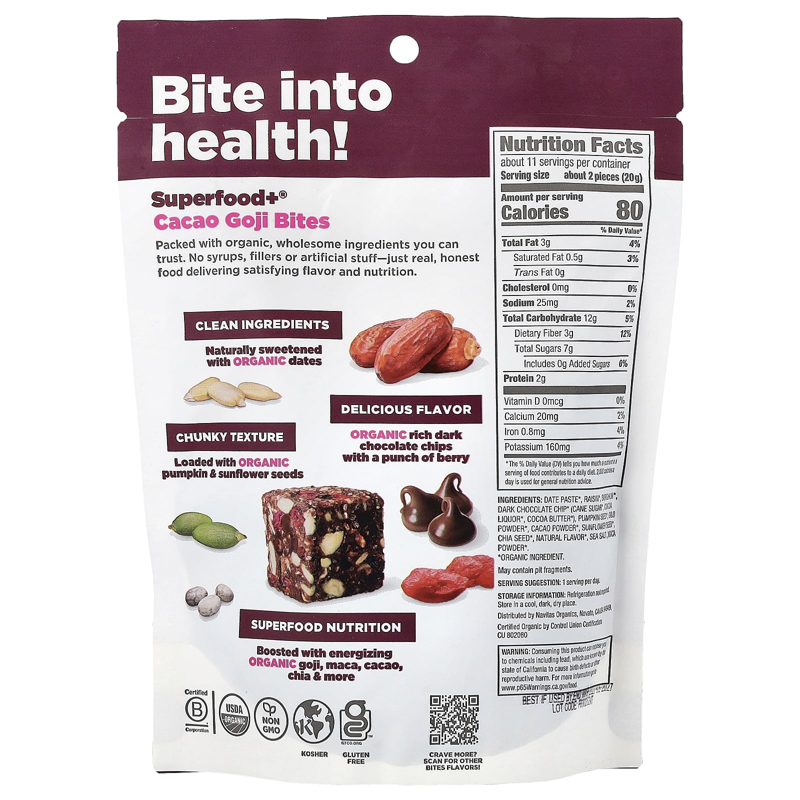 Содержит тонизирующие органические годжи, маку, какао, чиа и другие ингредиенты