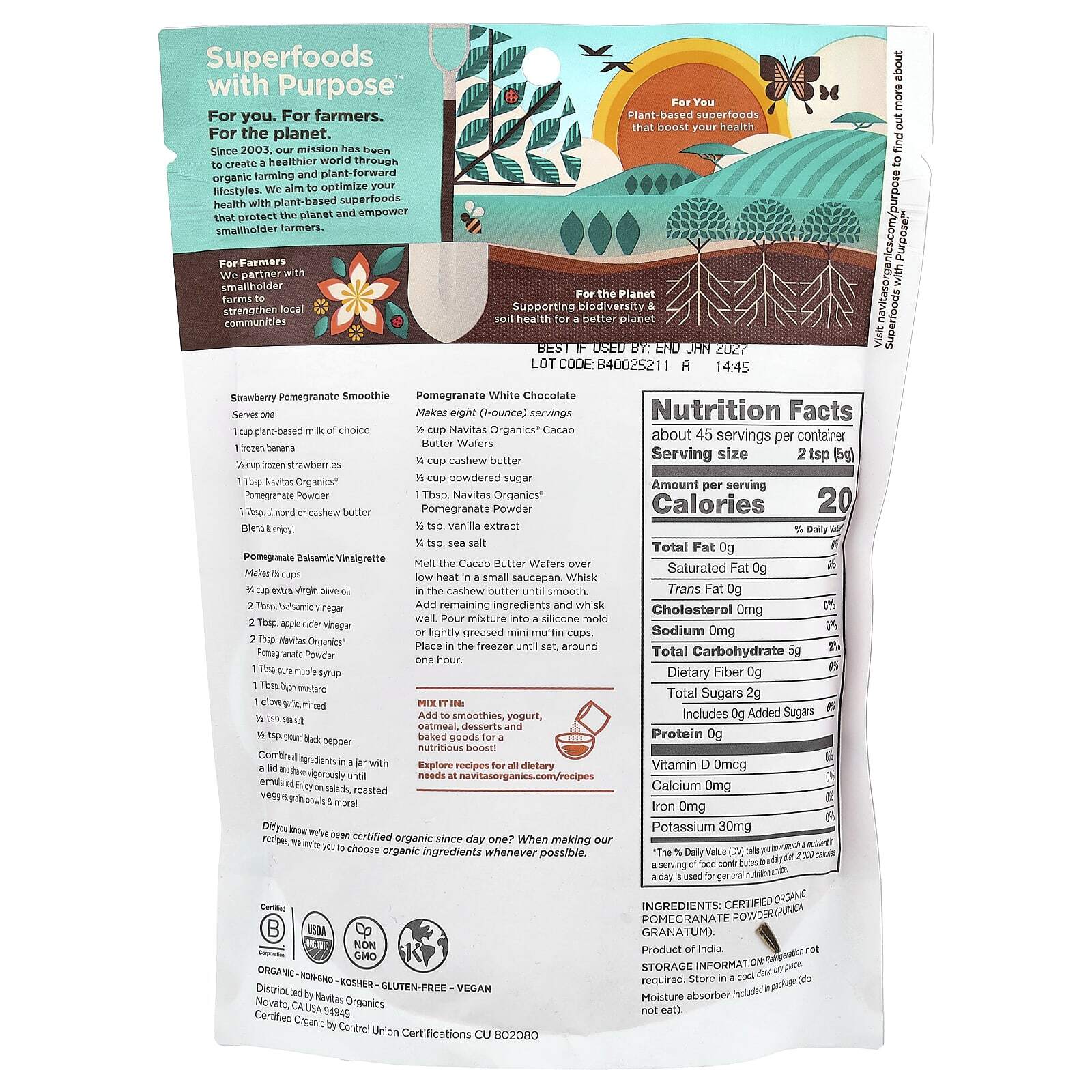 С 2003 года наша миссия — сделать мир более здоровым с помощью органического сельского хозяйства и здорового образа жизни. Мы стремимся укрепить ваше здоровье с помощью растительных суперфудов, которые защищают планету и расширяют возможности мелких фермеров.